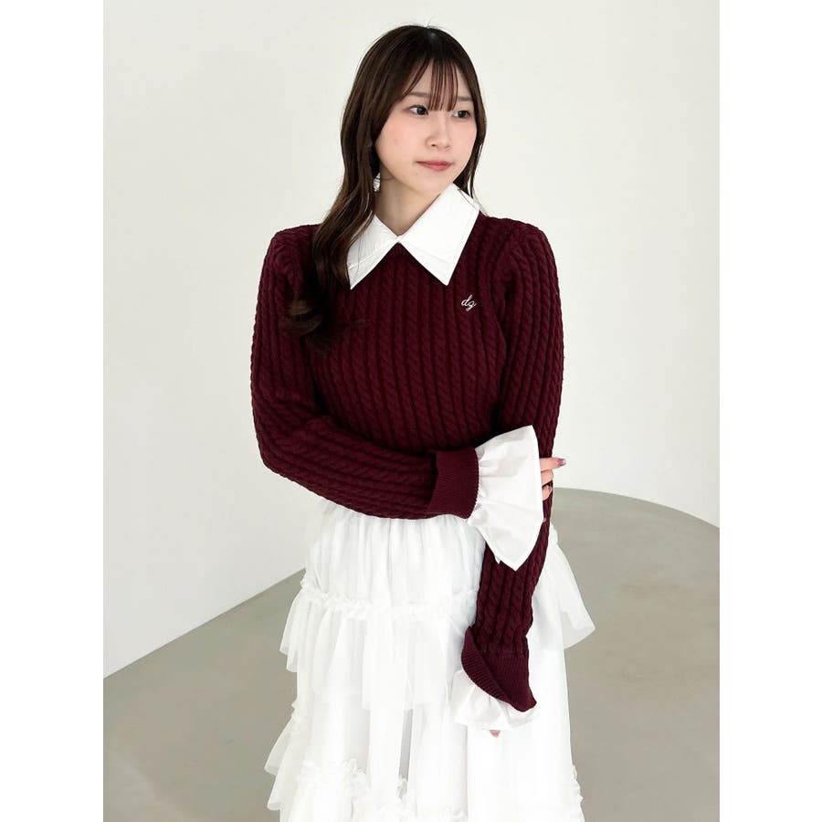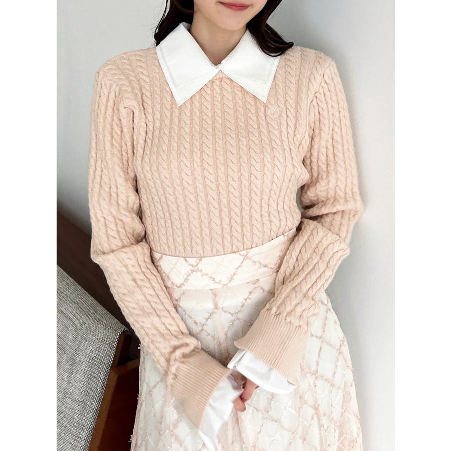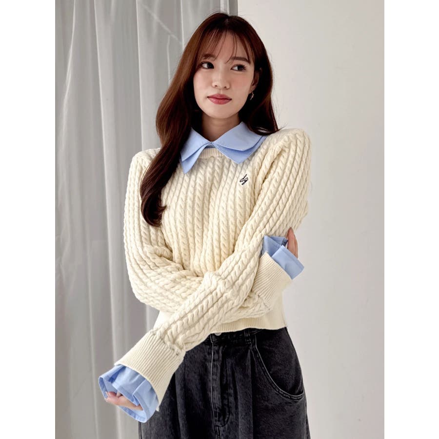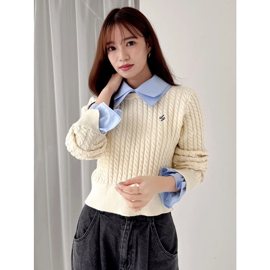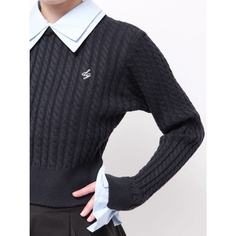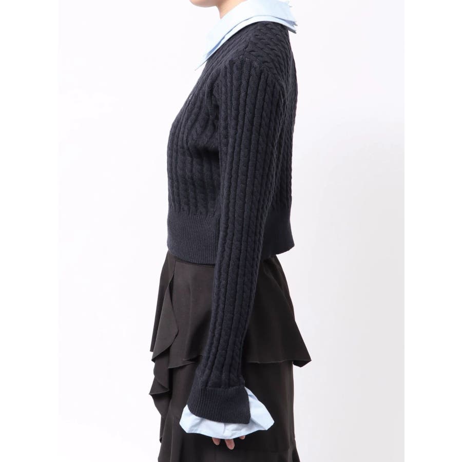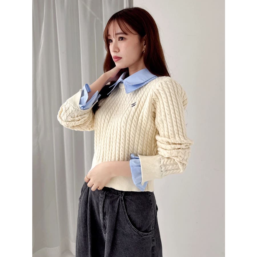 【アイテム】配色異素材ドッキングのケーブルニットプルオーバー。襟とカフスにはシャツ生地を使用し、トレンドの重ね着風のデザインで、一枚でもサマになるアイテムです。コンパクトなシルエットとケーブル編みの立体感が女性らしい印象を引き立て、胸元の刺繍ロゴがさりげないアクセントに。ニット部分は柔らかく伸縮性があり、着心地も抜群です。 【スタイリング】ベーシックなデザインで着回し力の高い一枚です。ボトムにワイドパンツや台形ミニスカートを合わせれば、トラッド感のある上品なスタイルに。フレアスカートなどと合わせてフェミニンカジュアルスタイルに仕上げます。 ---------------------------------------------------- 気になるアイテムはお気に入り登録がおすすめ 入荷情報やラスト1点、お得なプライスダウンの情報をいち早くお届け! ぜひご登録ください◎ ---------------------------------------------------- ※実際にお届けする商品と仕様やサイズが異なる場合がございます。 また生産の都合上、お届け時期が前後する場合がございます。 【商品特徴】透け感:なし伸縮性:あり生地の厚さ:厚手サイズ感:普通裏地:なしポケット:なし