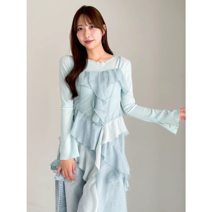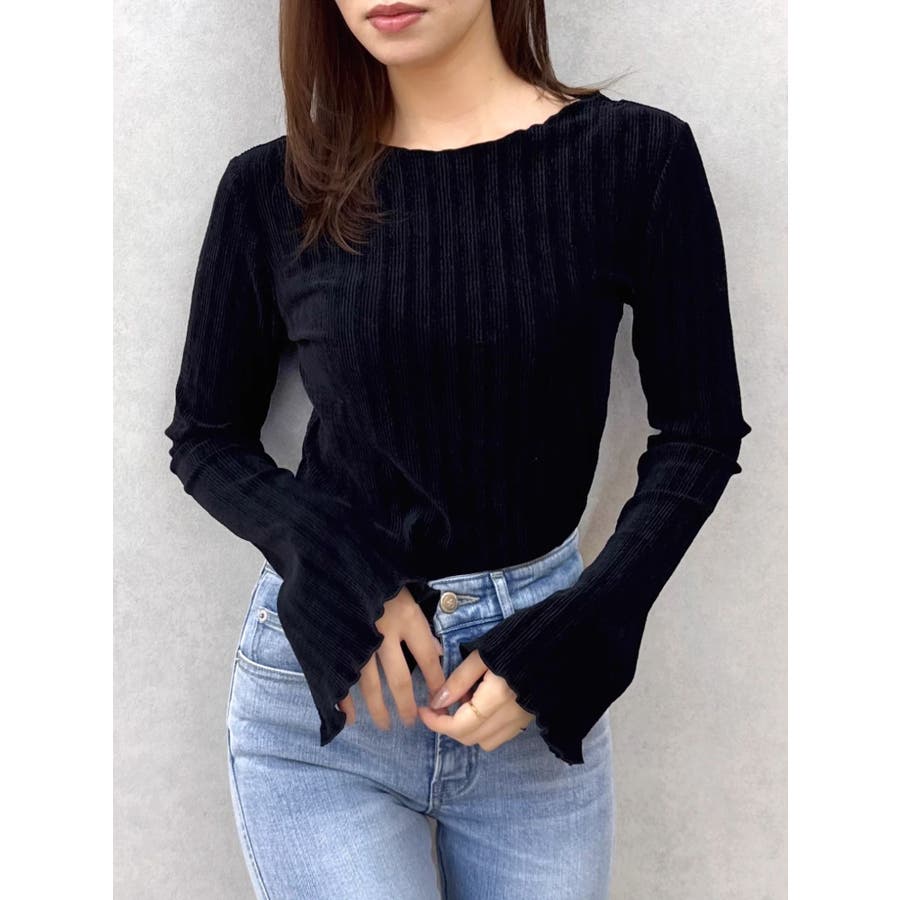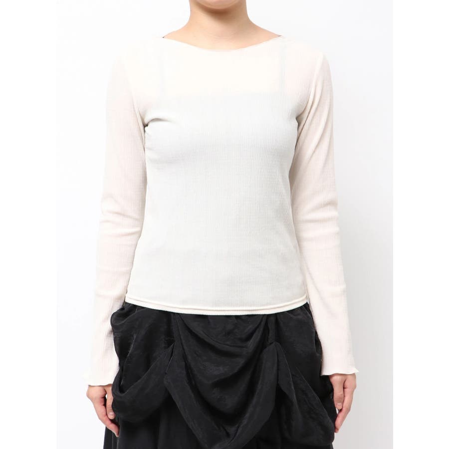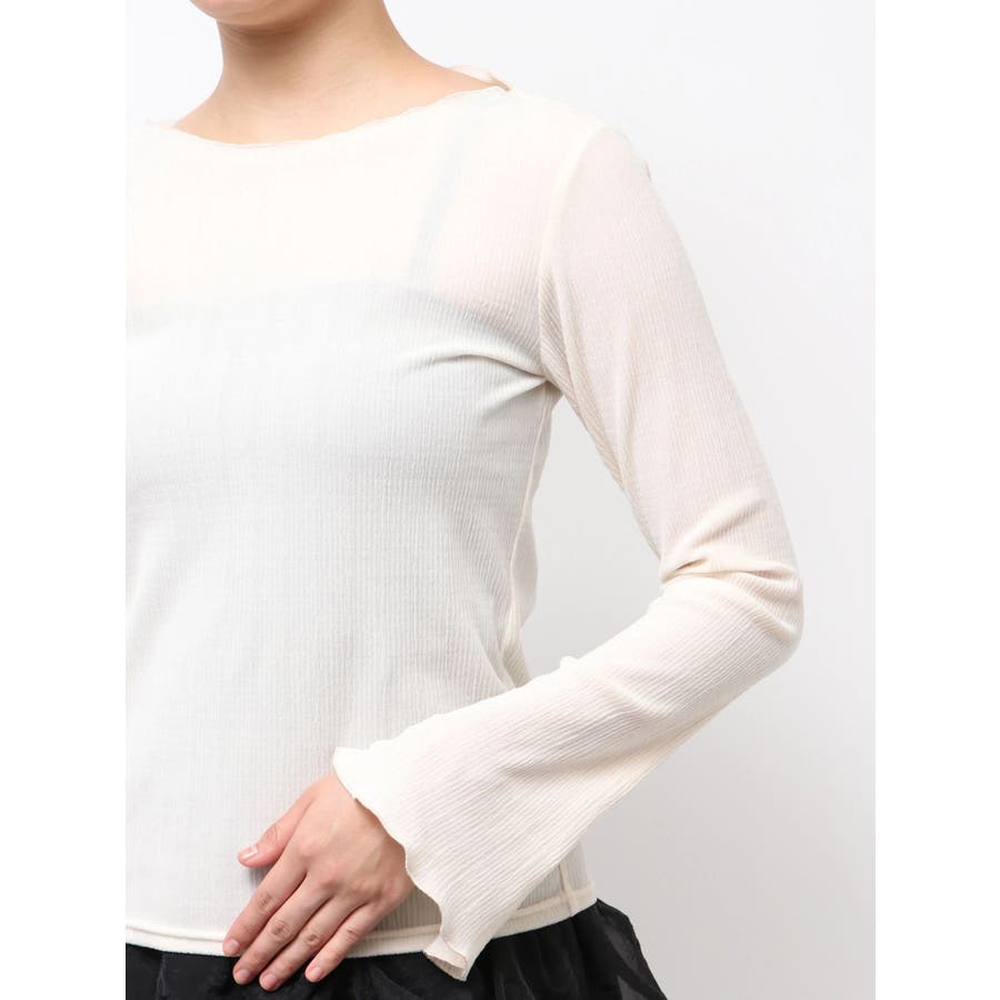 【商品】ほどよい透け感と上品な微光沢が魅力の、シアーベロア素材を使用したフェミニントップス。袖口にはギャザーを施し、1枚でもデザイン性のある仕上がりに。ストレッチ性があり、被りで着脱できるイージー仕様。インナー付きで透け感を気にせず着用でき、春夏のレイヤードスタイルにぴったりなアイテムです。【スタイリング】キャミワンピースのインナーとして合わせれば、透け感と光沢が映えるフェミニンスタイルに。ビスチェやベストとレイヤードすれば、トレンド感のある着こなしが完成。デニムと合わせてカジュアルダウンしても、素材の華やかさでこなれ感を演出。【商品特徴】透け感:あり伸縮性:ややあり生地の厚さ:薄手サイズ感:普通裏地:なしポケット:なし