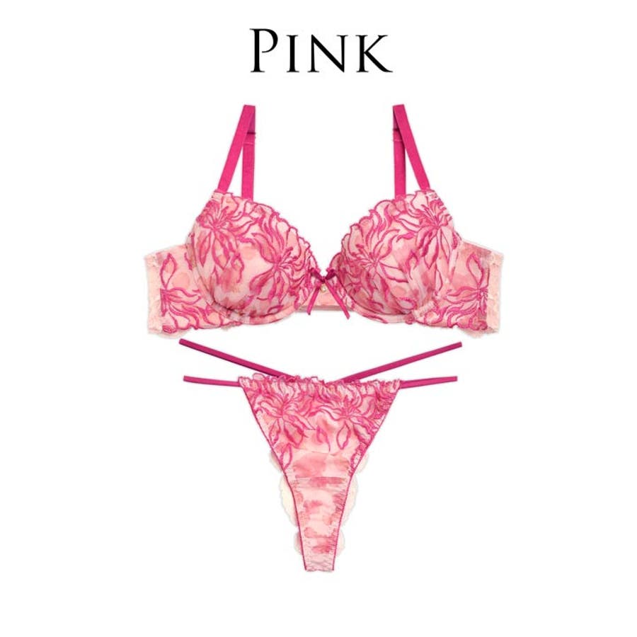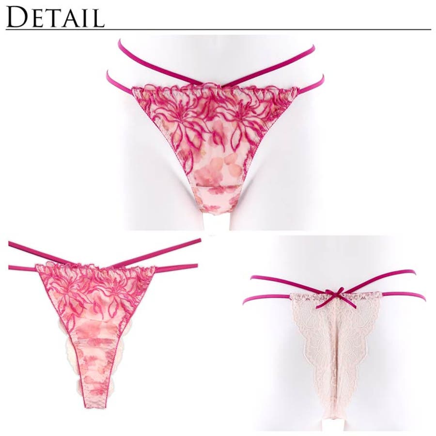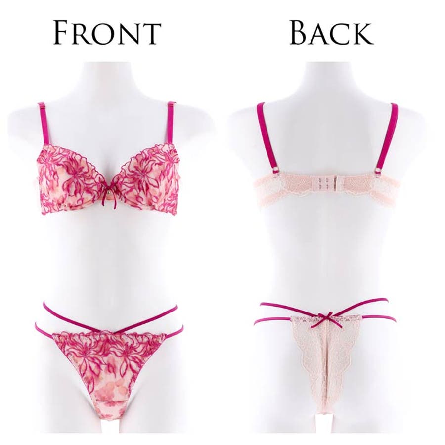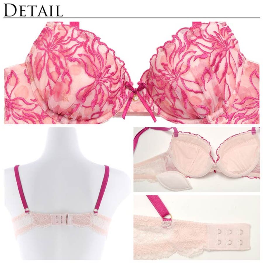 満開のユリを刺繍で描いたランジェリー。また、生地にはバラや舞い落ちる花びらの様子を水彩画のような淡いプリントで表現したデザインのブラショーツ。ショーツはダブルストリングとバックレースで腰元からもキュートな甘い印象に。