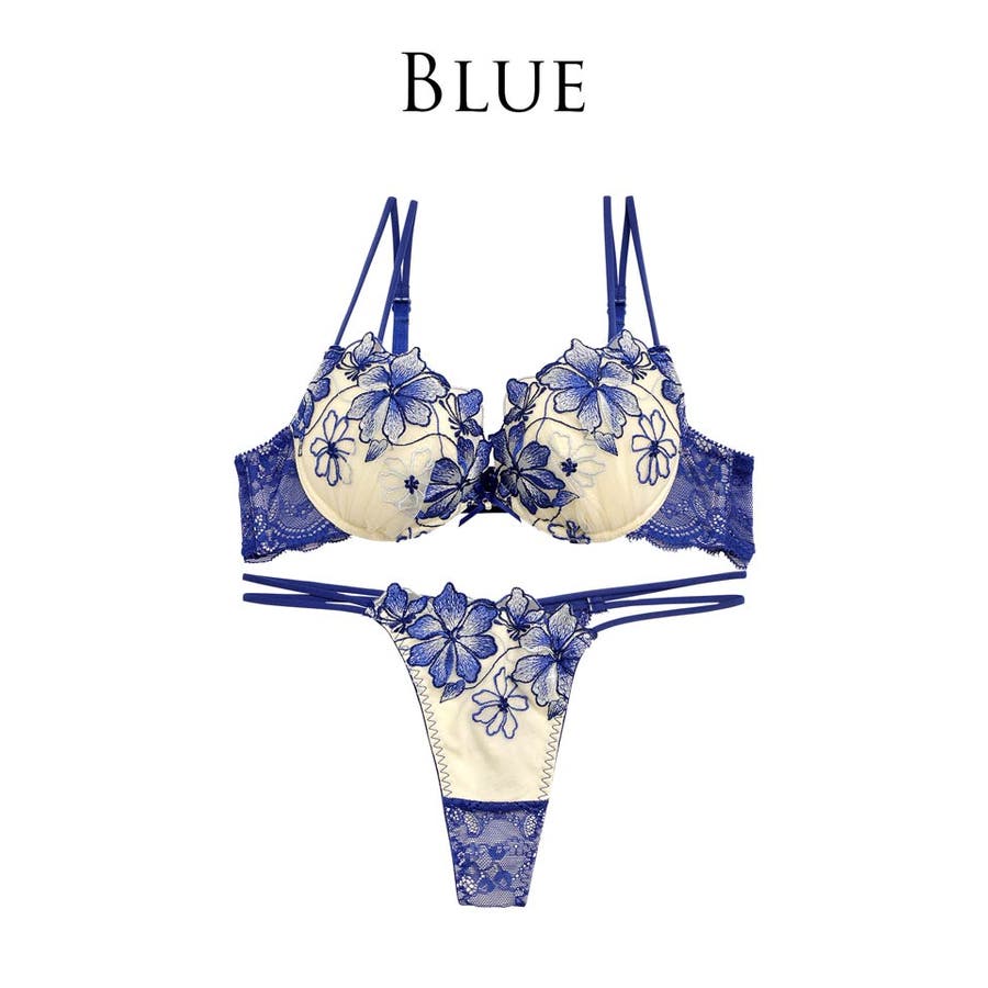 デコルテを華やかに飾るフラワー刺繍が美しいランジェリーに、新色BLUEが登場。ブラカップは胸に優しくフィットする立体裁断仕様なので、自然で綺麗な形のバストを形成してくれます。 ショーツのフロントは肌がちら見えするアシンメトリーデザインで、上品な色気を醸し出します。バックは素肌がほどよく透けるシアーレース仕様。