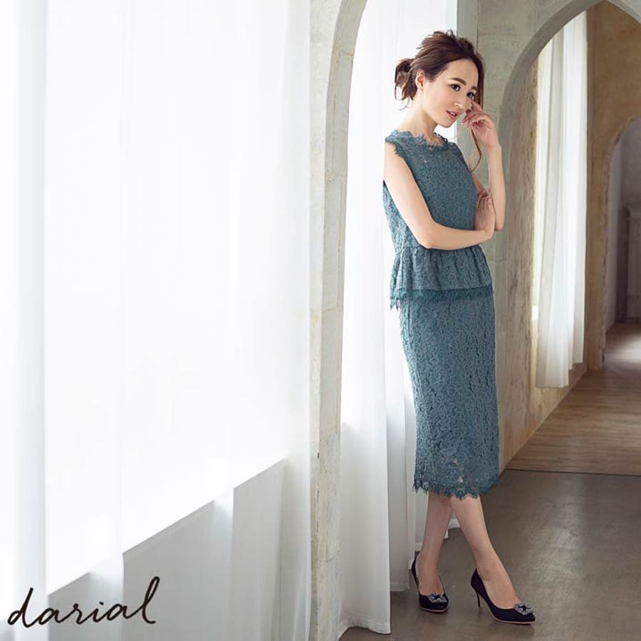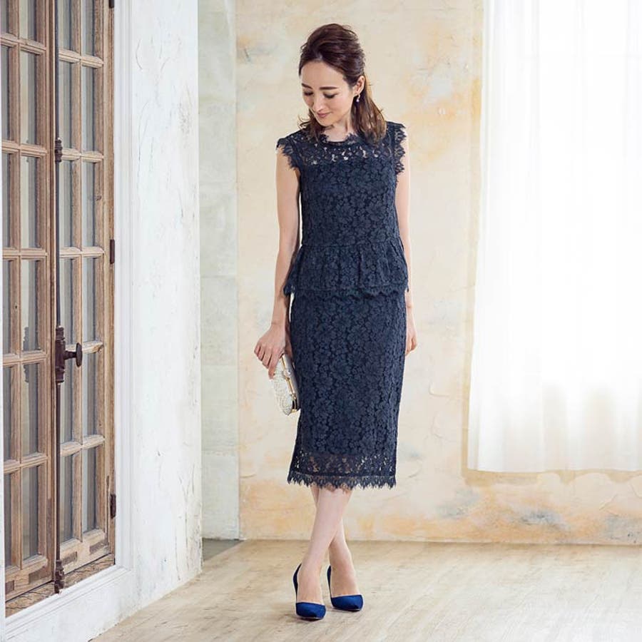 高級感漂う総レースセットアップでパーティーシーンでワンランク上の女性に。 デコルテから背中が透ける肌が大人の艶っぽさを演出。スカートバックにはスリットが入っており、後ろ姿まで女性らしさが溢れます。