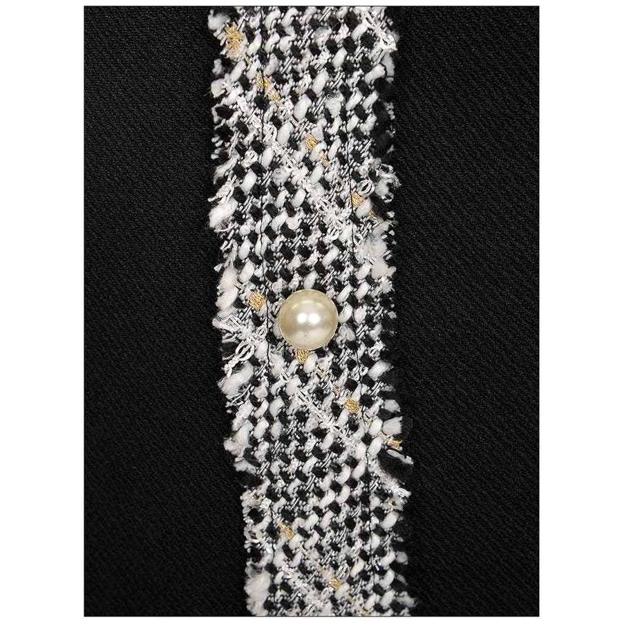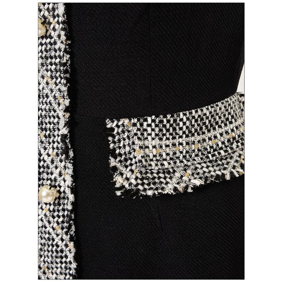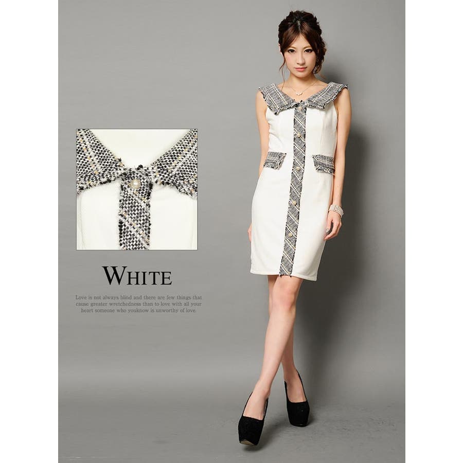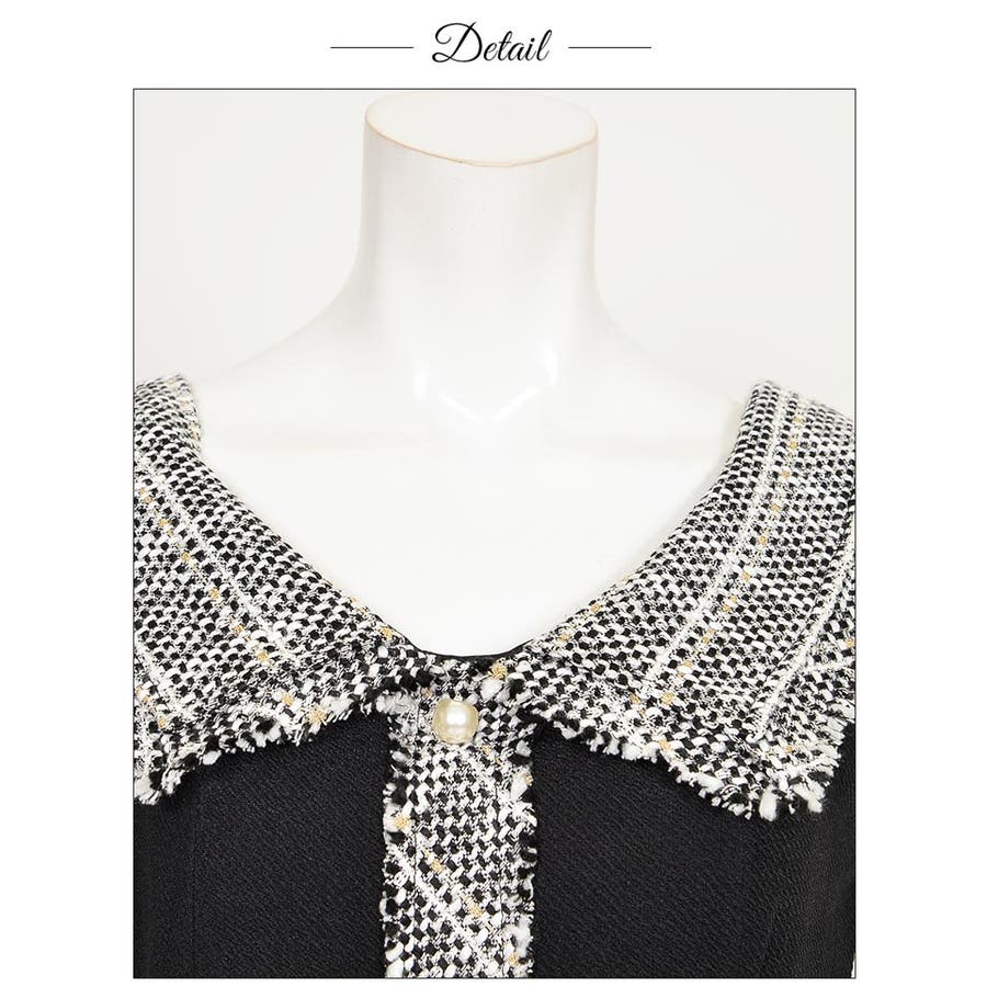 ツイードの襟が付いた個性的なノースリーブのタイトミニドレス。センターに配置されたツイードには大粒のパールが並べられ上品な印象に。