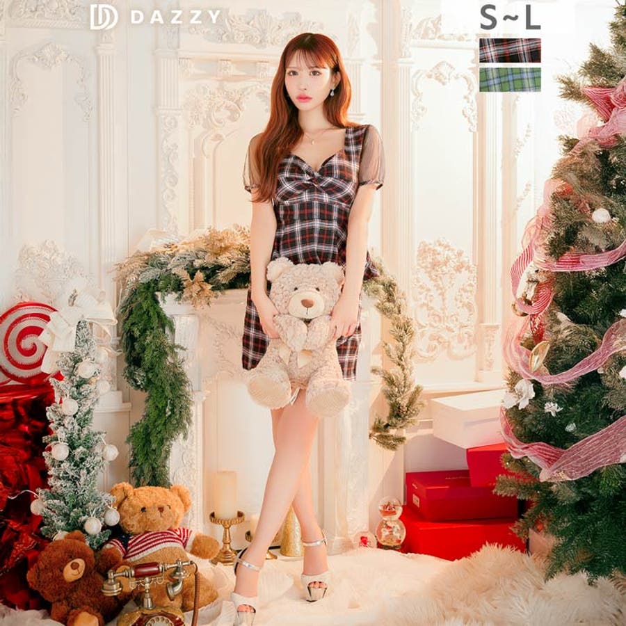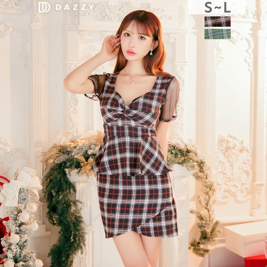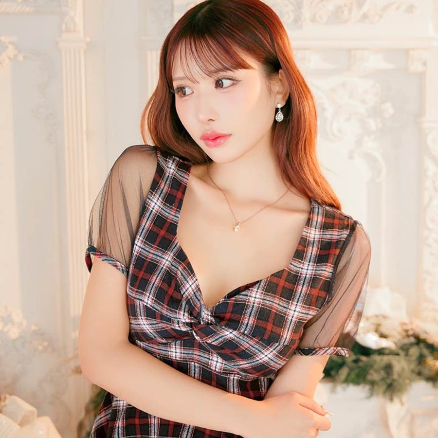 華やかなクリスマス風カラーのチェック柄がこれからのシーズンにぴったりのキャバドレス♪ふんわり広がるペプラムデザインで気になるお腹周りをカバーし、メリハリのあるボディラインに◎程よく透けるシアー袖が軽やかさと女性らしい色気をプラスしてくれます!