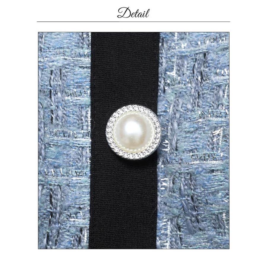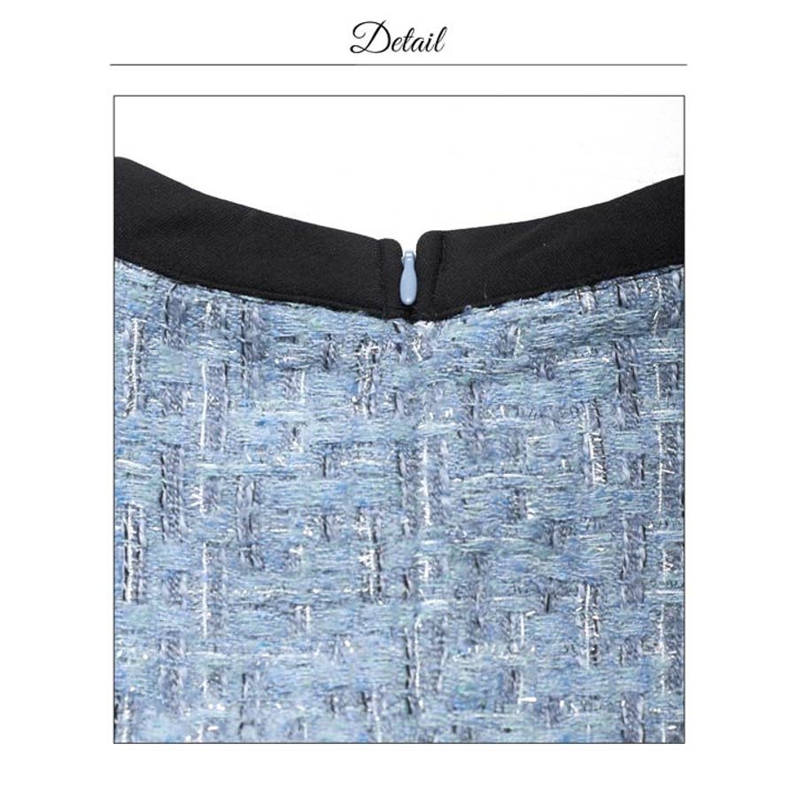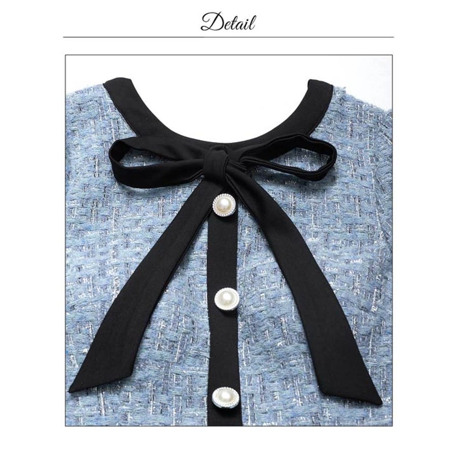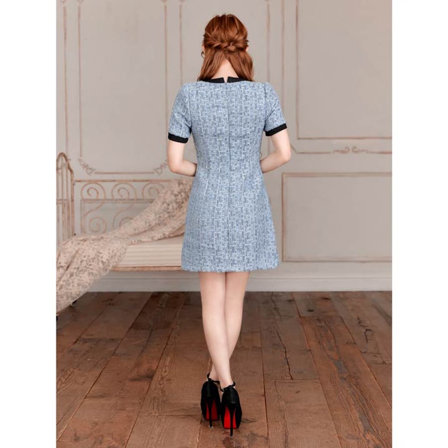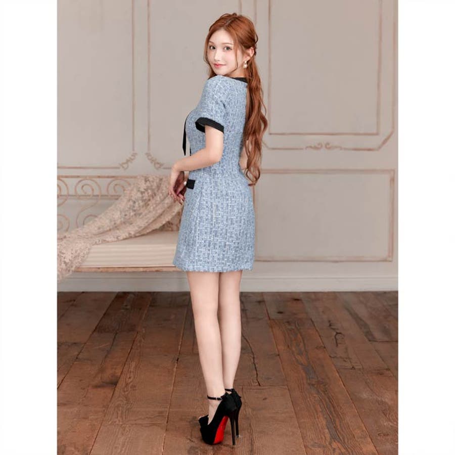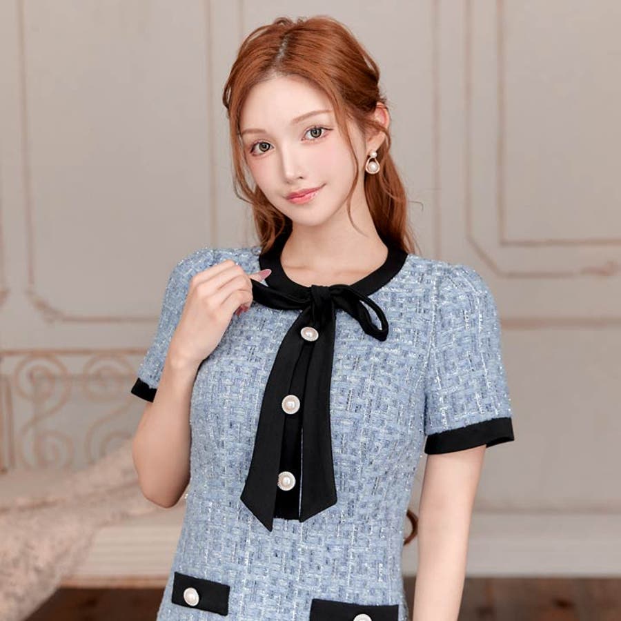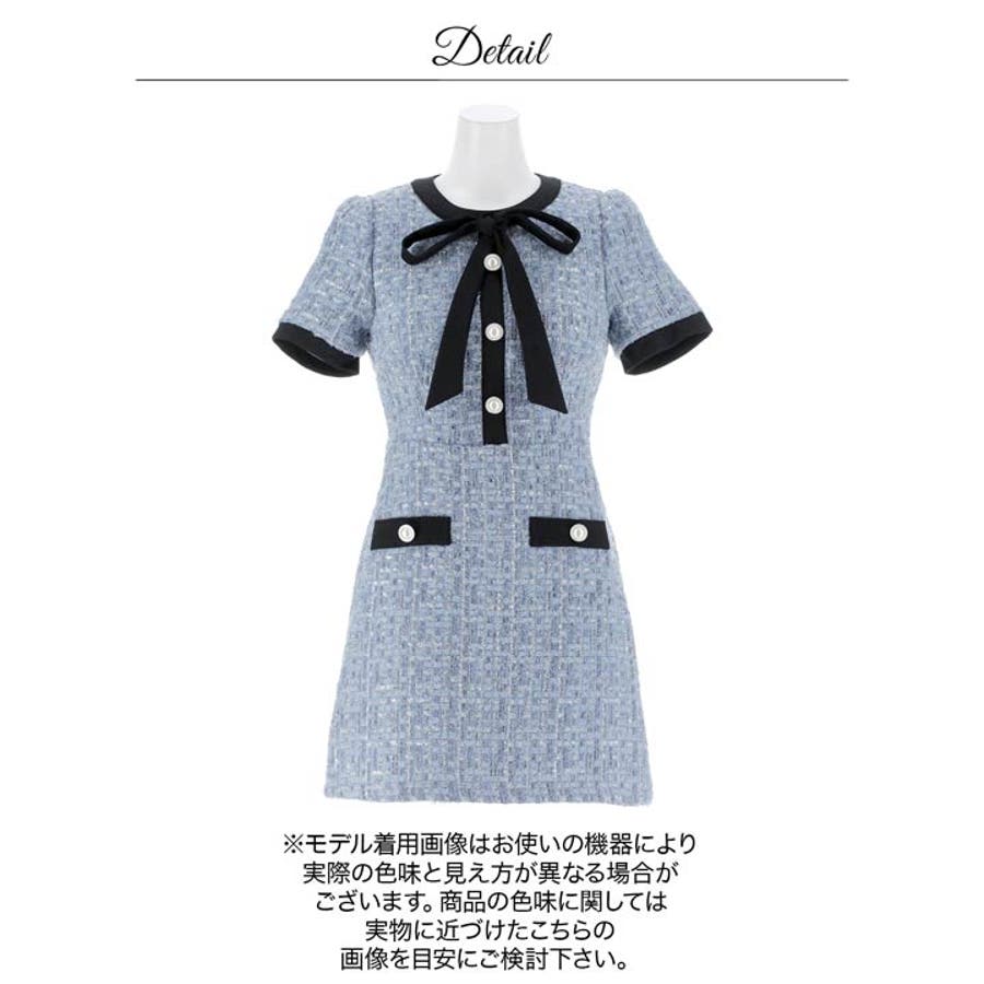 フロントリボンツイードパールボタン半袖Aラインミニ丈キャバドレス[SML 3サイ…