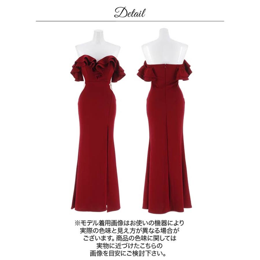 デコルテや背中を美しく魅せる大人レディなオフショルロングドレス。ふんわり広がるフリルは華やかさをUPさせるだけでなく胸元のボリュームアップにも◎ウエストサイドのシアーデザインがくびれを強調し、女性らしいメリハリシルエットを演出します♪