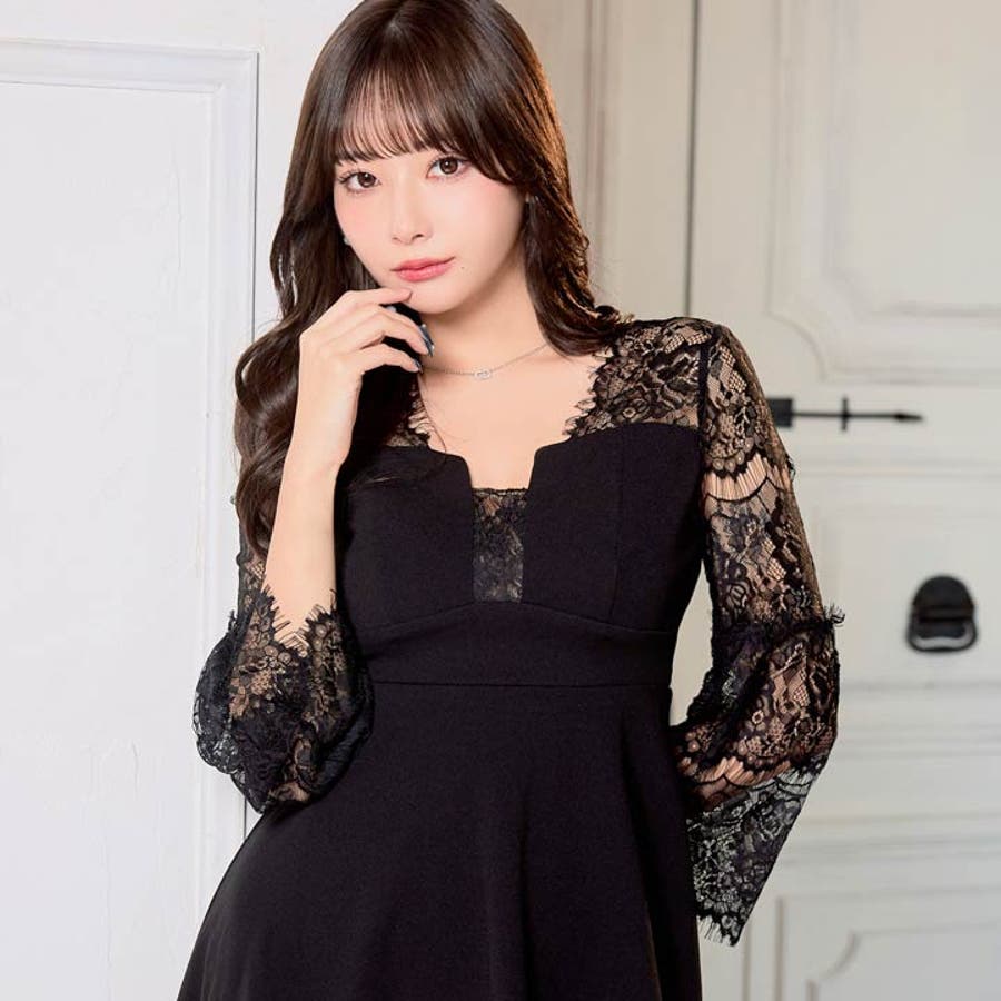 シンプルなワンカラーのAラインミニドレス。袖部分が透けレースで控えめな肌見せがセクシーな印象に♪長袖で二の腕カバーしながら大人な女性に見える一着です♪