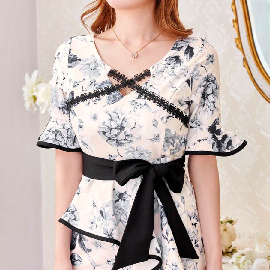 センシュアルなクロスデザインが思わせぶりなタイトミニドレス。 全体に施された大小さまざまなフラワープリントや、ウエストから広がるフリルのシルエットがノーブルな可憐さを漂わせる。 初夏のヒロインになれる1着をぜひウィッシュリストに加えて。