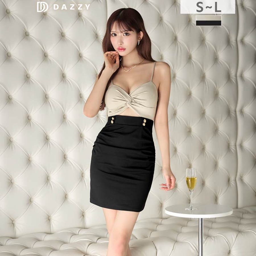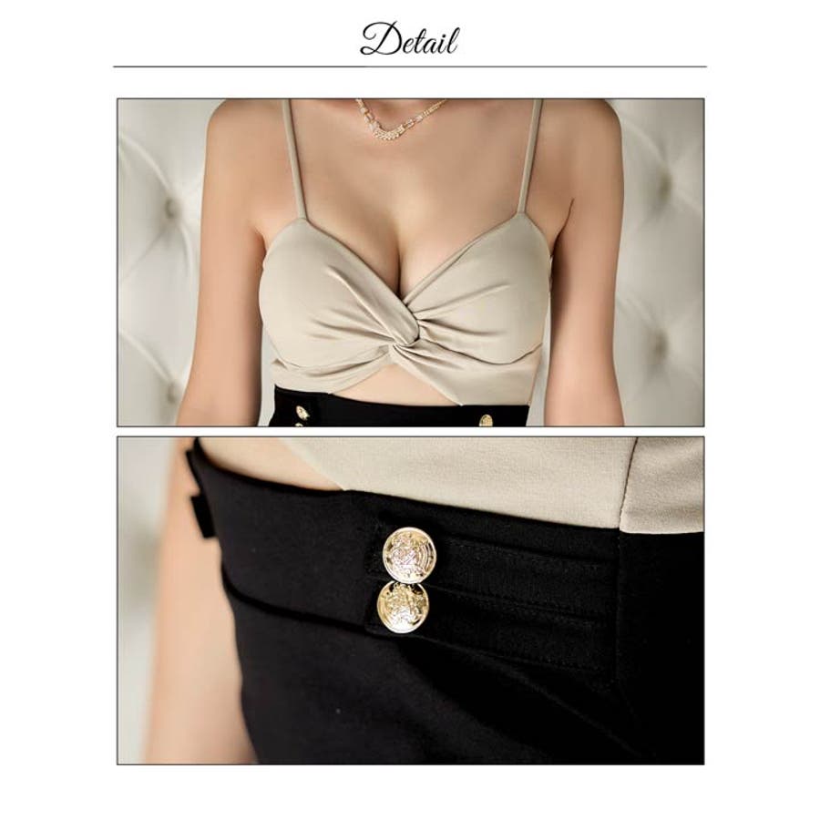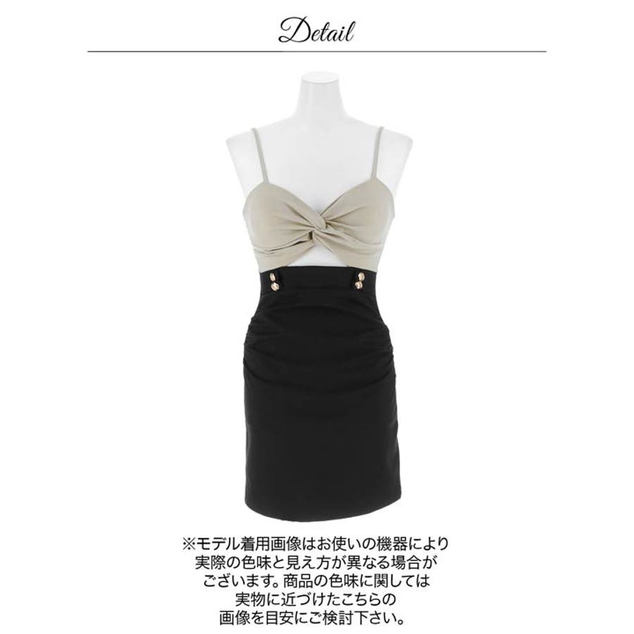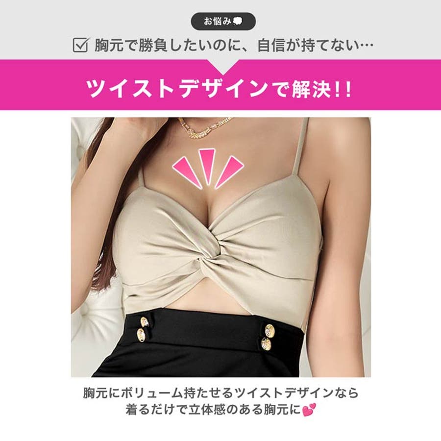 バストへ視線を集めるツイストデザインがアクセント!セクシーな肌見せを演出するキャミソールのキャバドレス。ウエストカット&ハイウエスト切り替えで脚長効果も抜群◎ストレッチの効いた素材なので着心地がらくちんなのも嬉しいポイントです♪