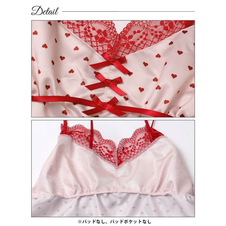 なめらかなサテン生地にちいさなハートをたっぷりと詰め込んだラブリーデザインのランジェリー。胸元の繊細なレースやサテンリボンがアクセントになっています♪おそろいシリーズのブラセットやTバックショーツとのコーデがおすすめです!