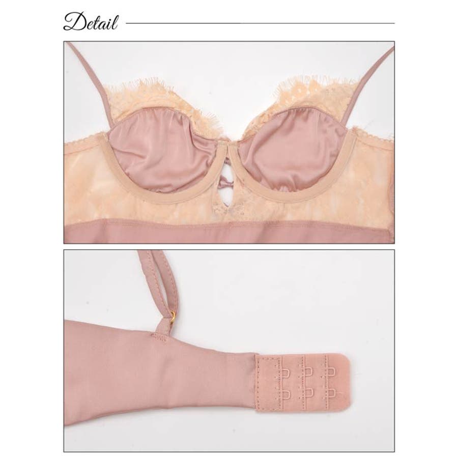 なめらかなサテンにフラワー刺繍のアイラッシュレースを重ねたベビードール。背中の大胆なカットアウトで後ろ姿からも色気が漂うデザイン♪カップはワイヤー入り&バックホック付きで安定感も抜群です◎