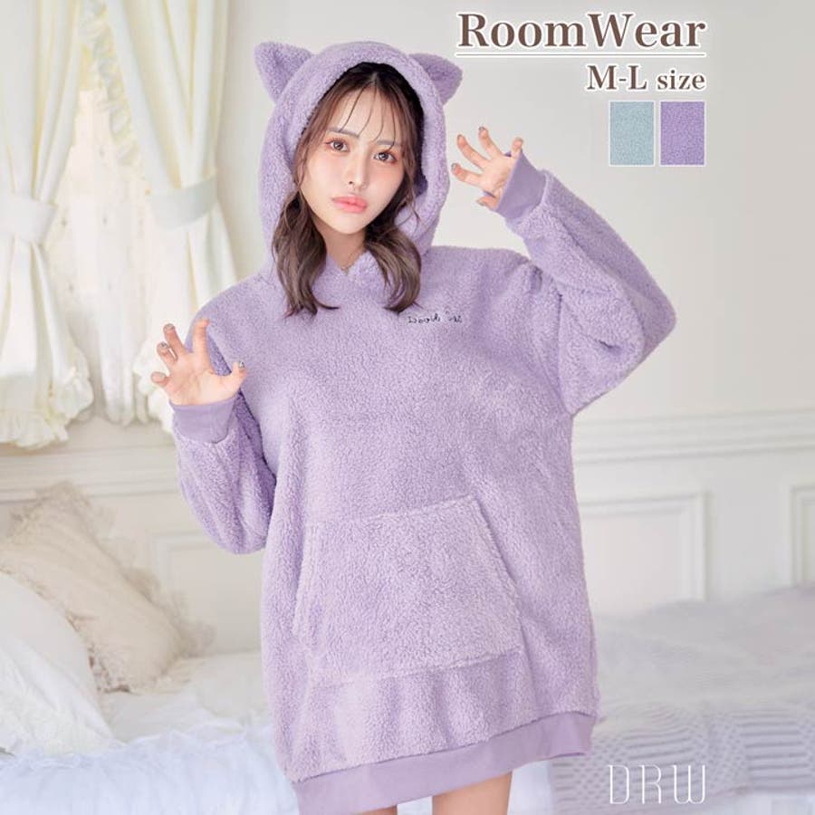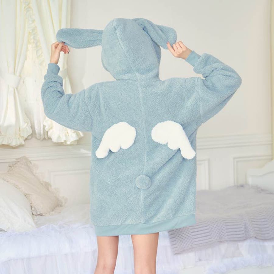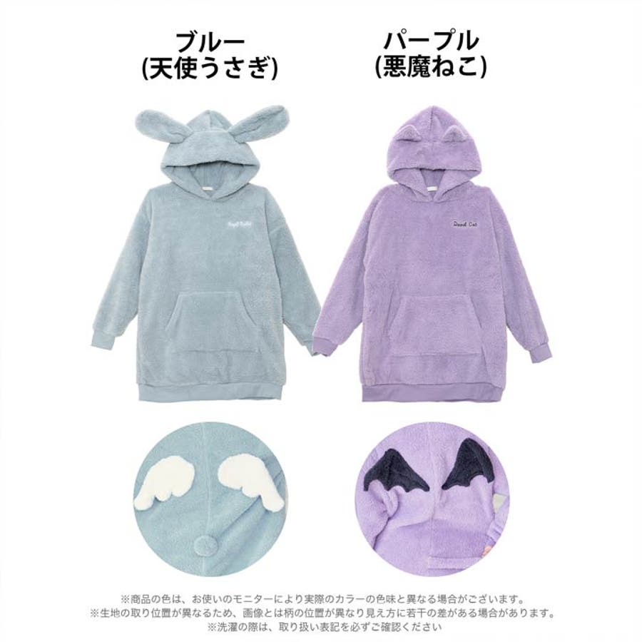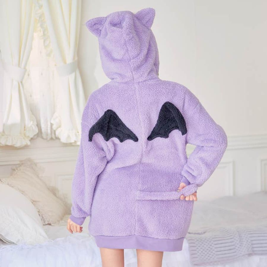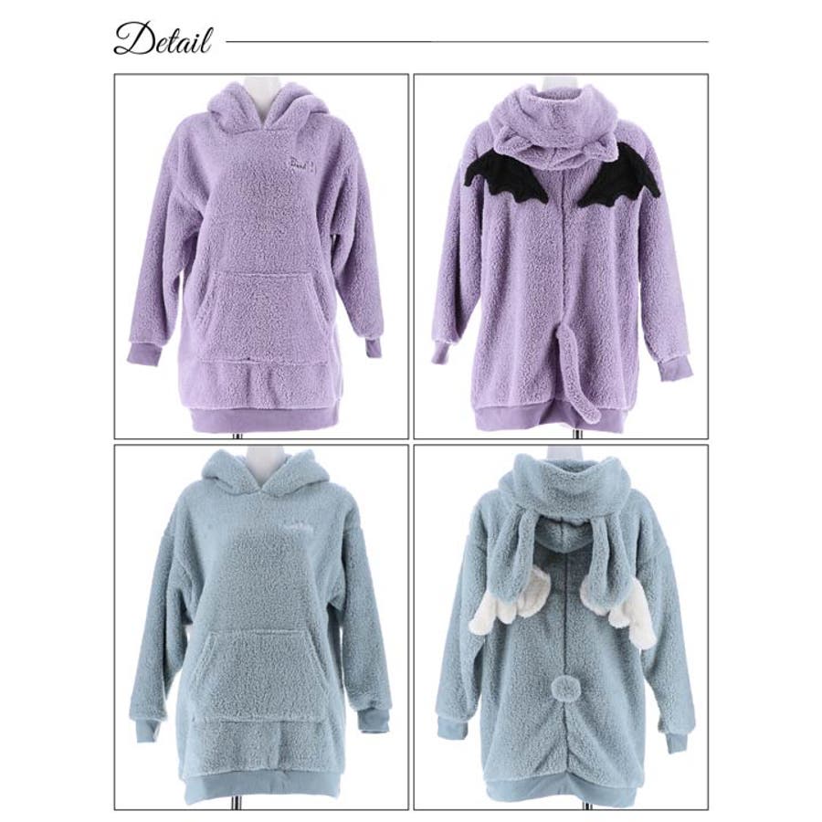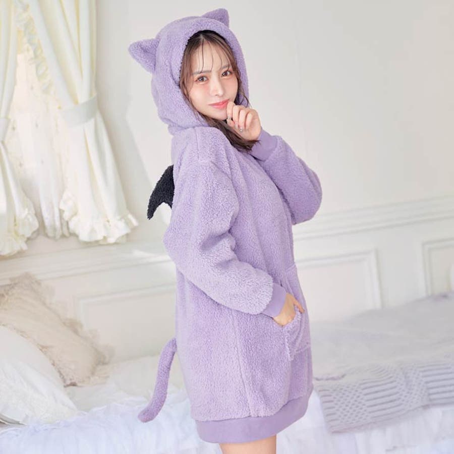 一枚でも着れちゃうビッグシルエットの暖かい素材が女の子らしいルームウェア。小悪魔な羽と尻尾を施した後ろ姿がとってもキュート♪ 耳付きフードもアクセントになったリラックスタイムにぴったりなアイテムです◎モデル…ひめか