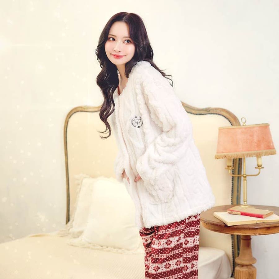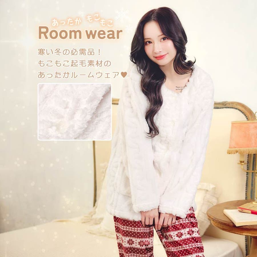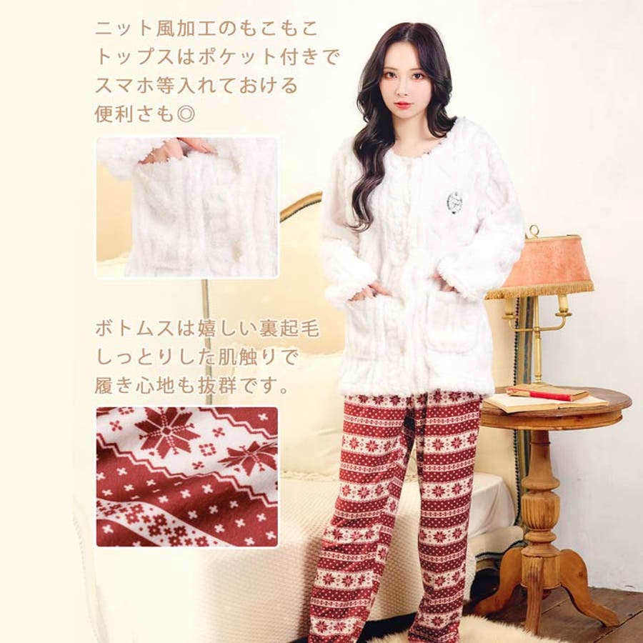 ふんわりモコモコのトップスと、ノルディック柄パンツが冬気分を高めてくれるルームウェアセット。トップスは毛足の長い柔らかな素材で、包まれるようなあたたかさが魅力。ポケット付きなのでスマホなどの持ち運びにも便利♪リラックスタイムもほっこり可愛く過ごせる一着です!