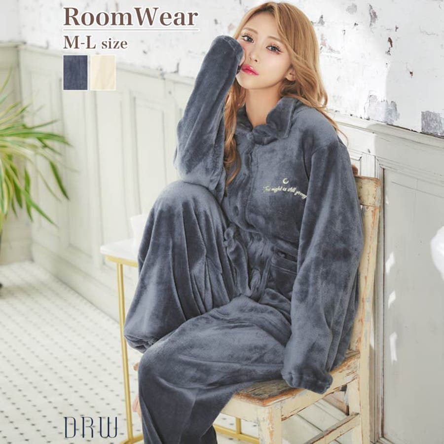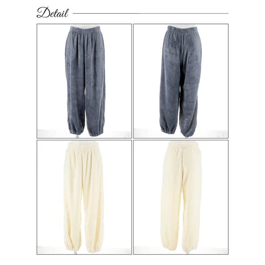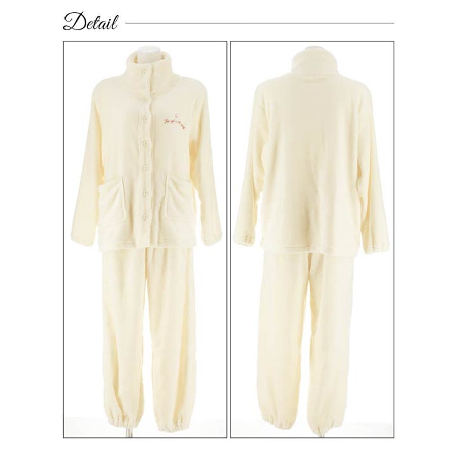 胸元のロゴ刺繍がアクセントになったふんわりモコモコ素材のトップス&ロングパンツルームウェア。