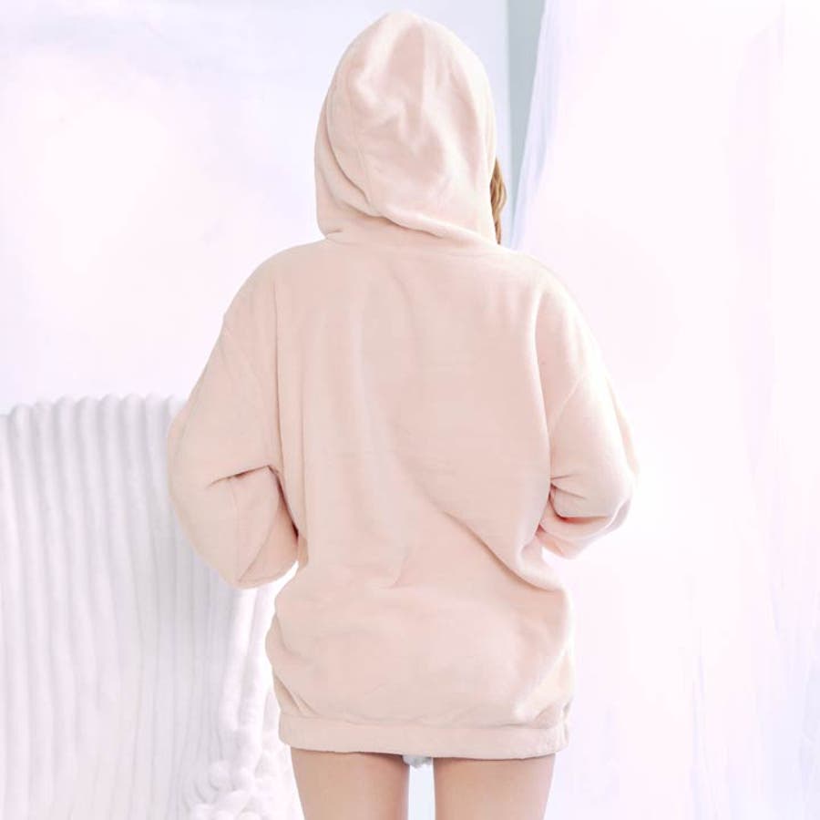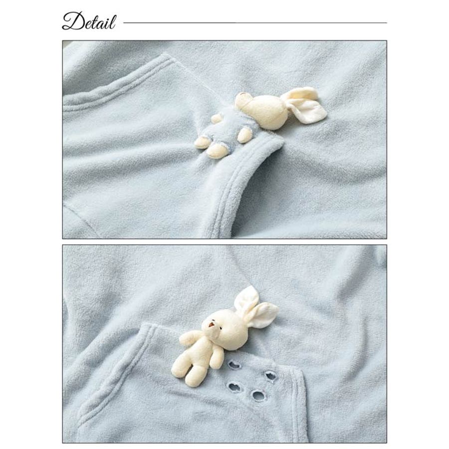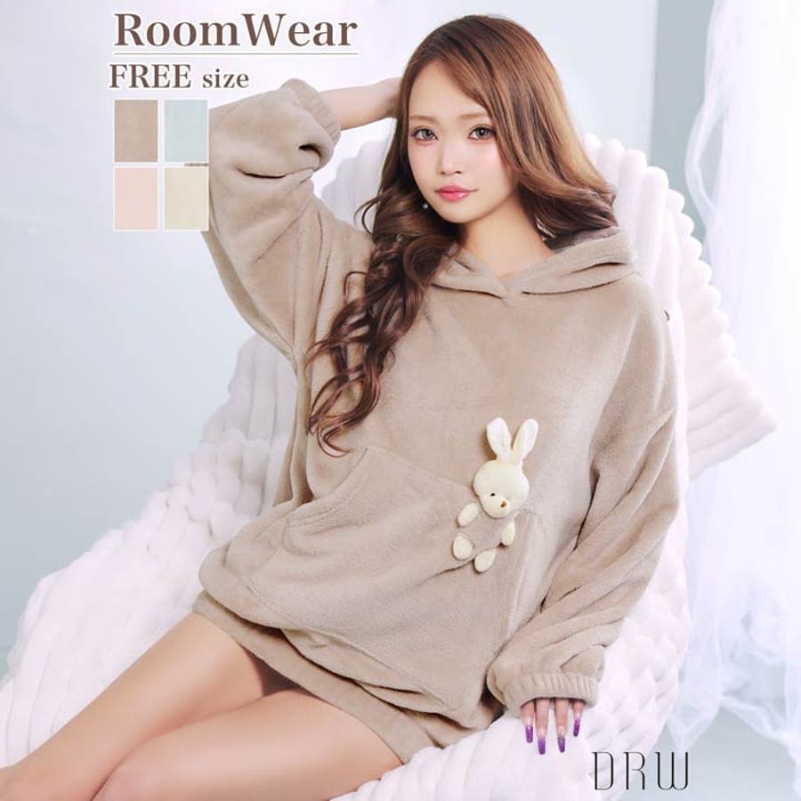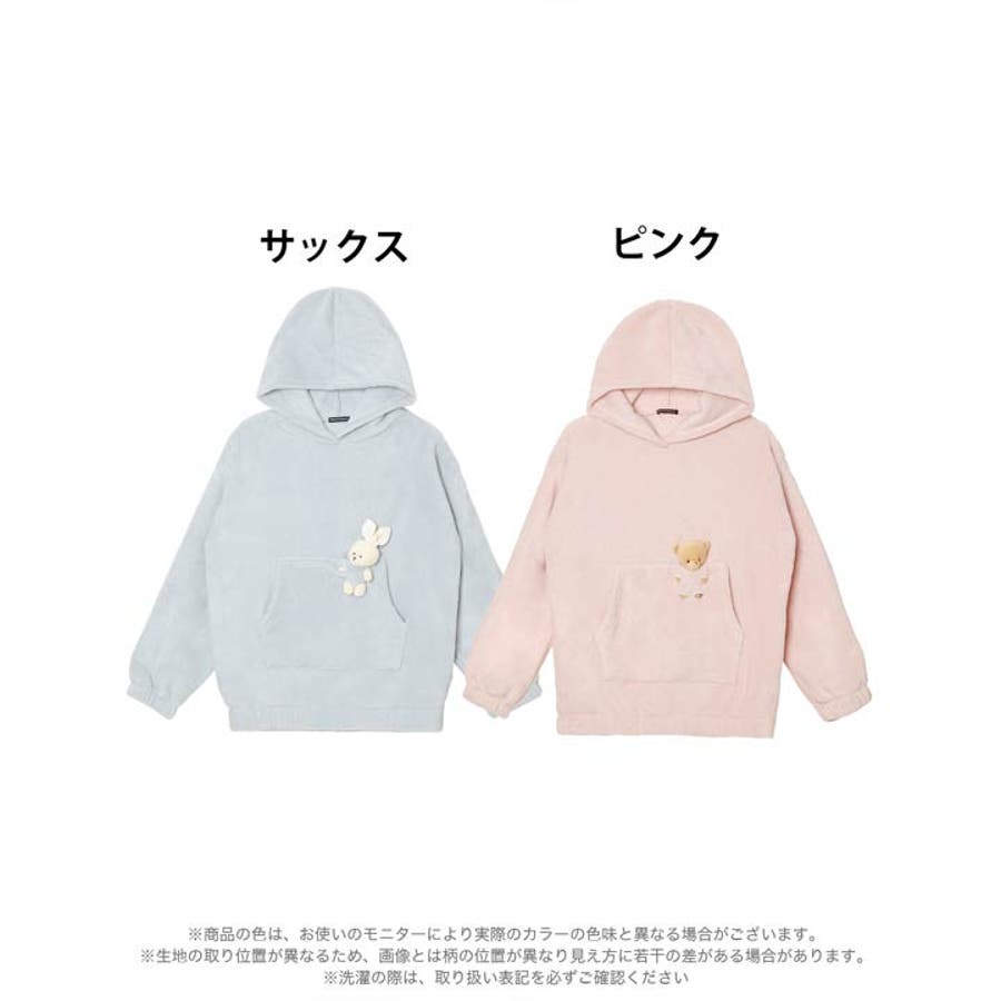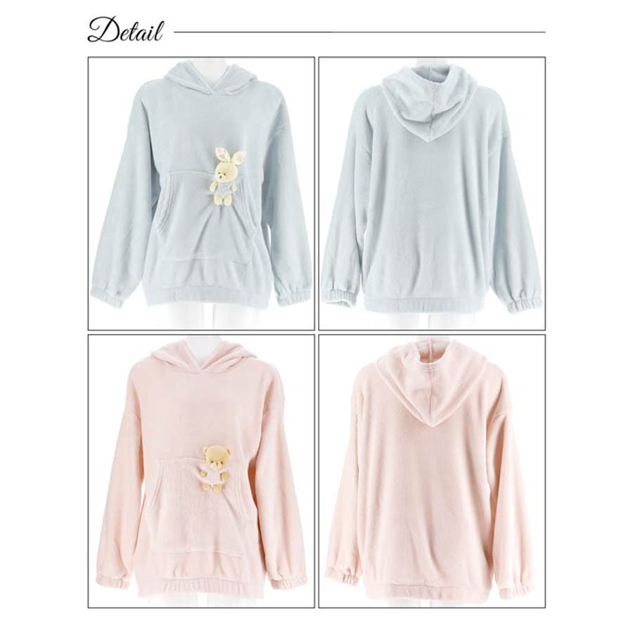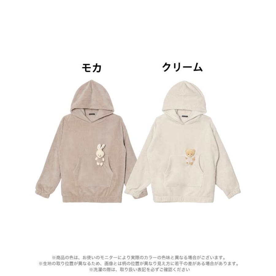 ポケット部分にくま・うさぎのマスコットが付いた、暖かく肌触りの良いもこもこ素材のパーカー。