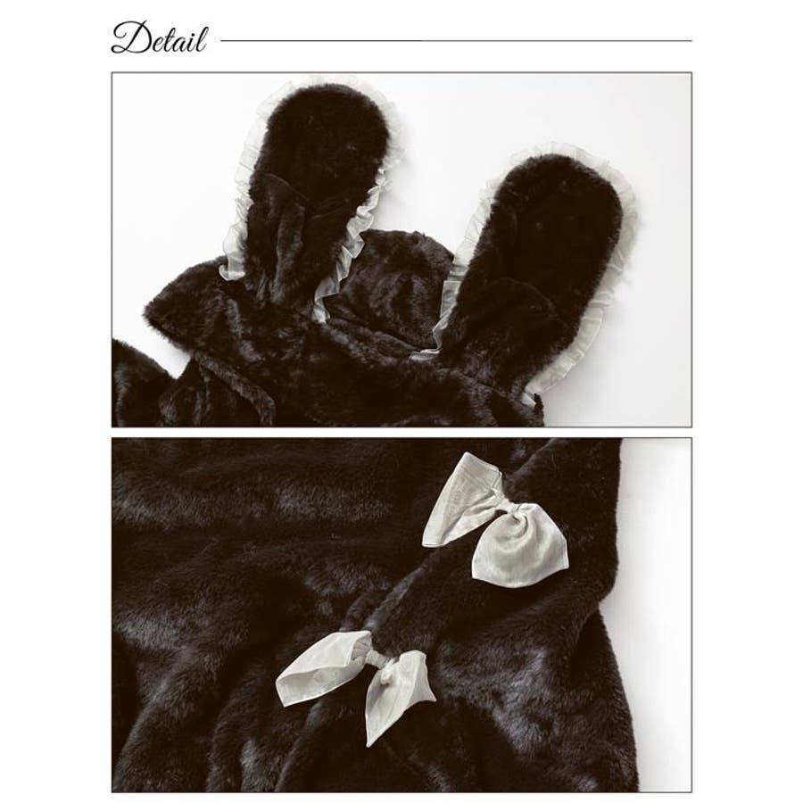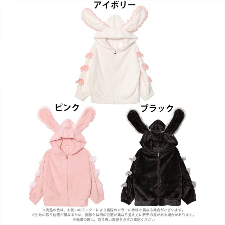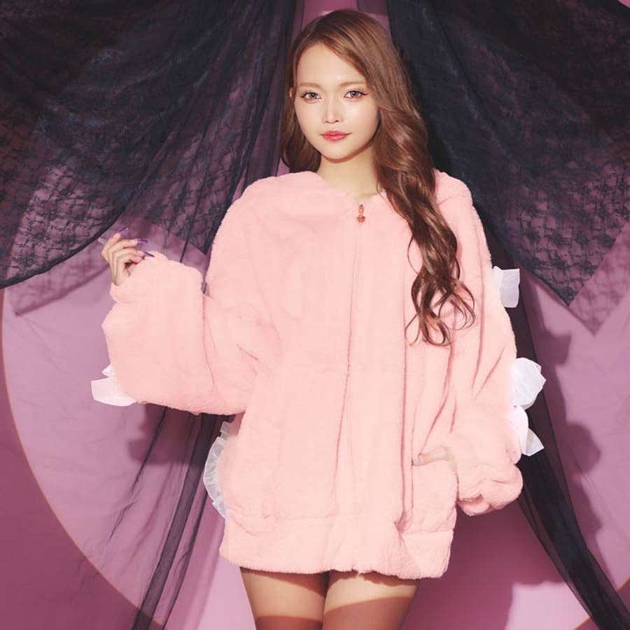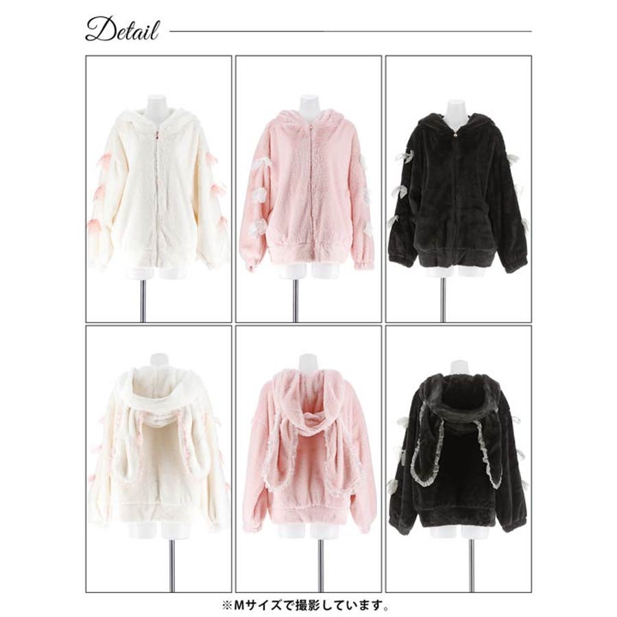 フリル付きのうさ耳フードがポイントになった愛らしいもこもこ素材のパーカー。袖にあしらった大きなリボンやファスナーのハートチャームなど、ガーリーなディテールをぎゅっと詰め込みました♪おうち時間をあたたかく&とびきり可愛く過ごしたい日にぴったりです!