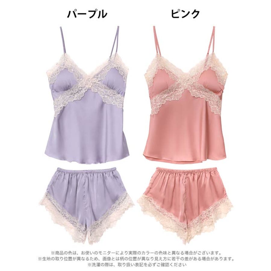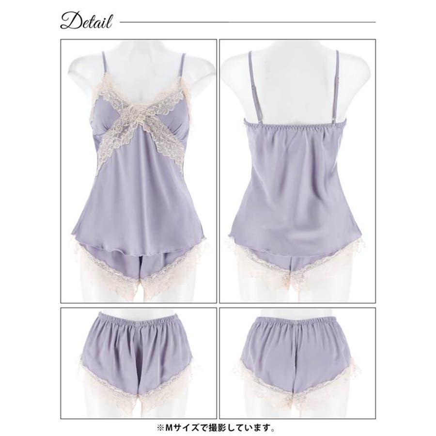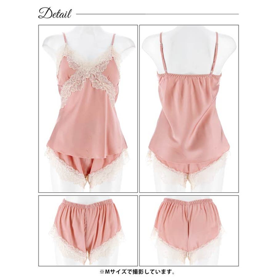 なめらかなパステルカラーのサテンに、透け感のあるレースで上品さを加えたベビードール&ショートパンツ。