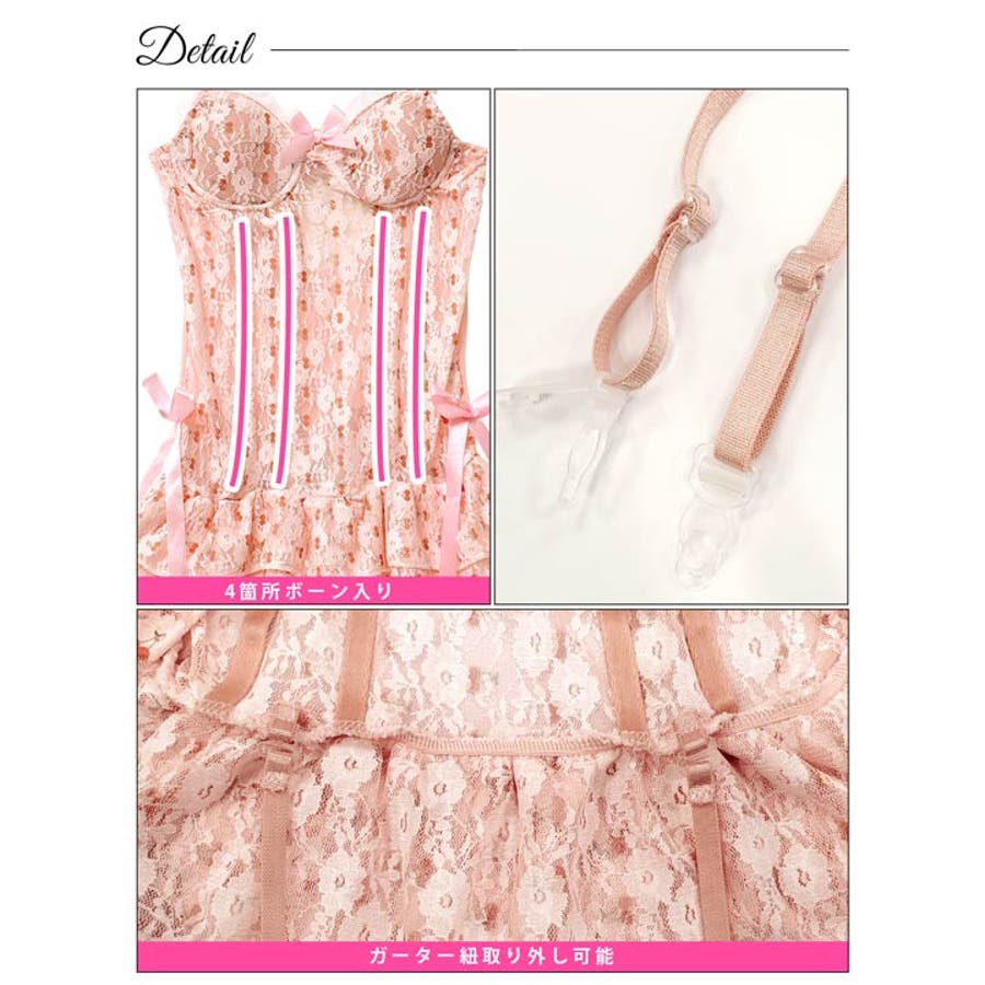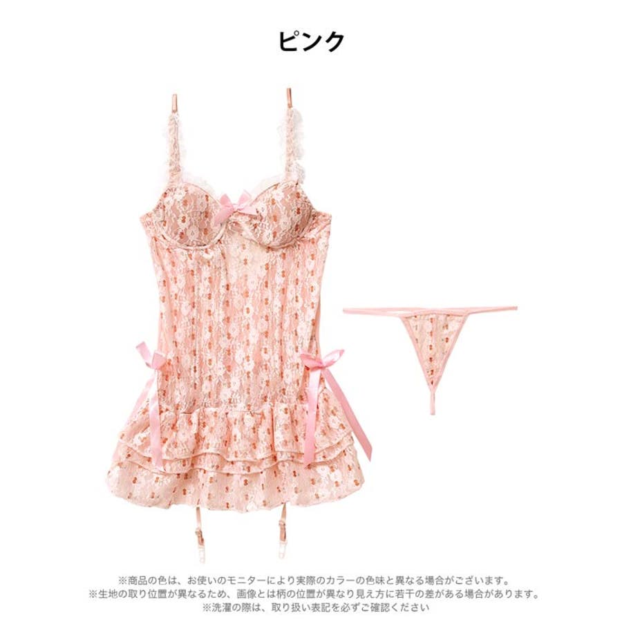 さくらんぼ×フラワーレースの組み合わせが乙女心くすぐるガーリーなランジェリー♪大きなサテンリボンやふんわりしたティアードフリルが華やかさ&可愛さをプラス!ガーターベルト付きなのでお手持ちのニーハイストッキングを合わせたコーデも楽しめます♪