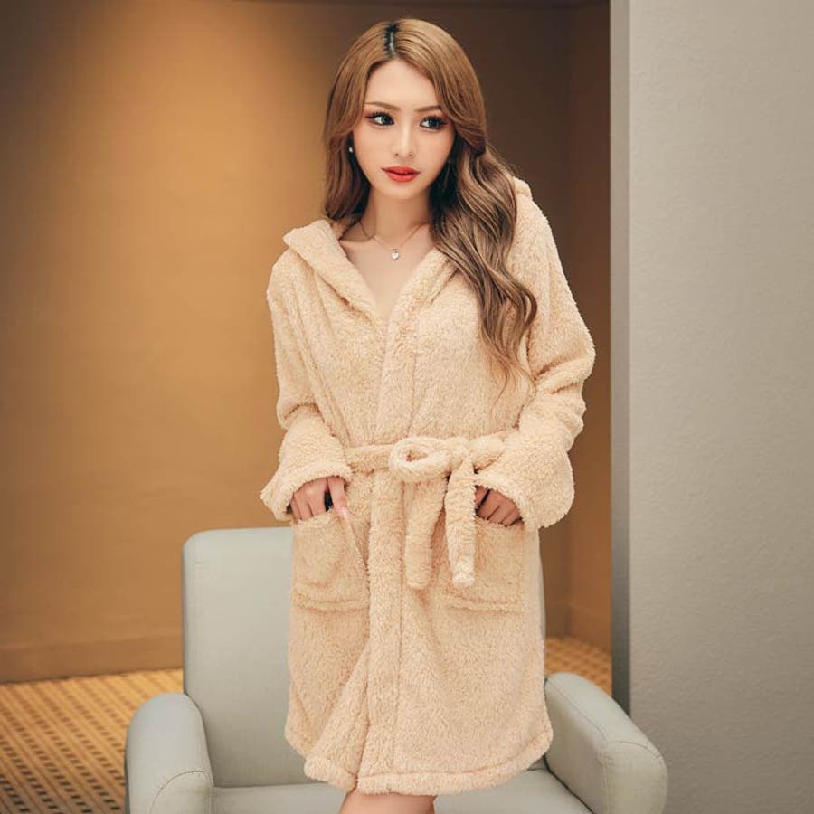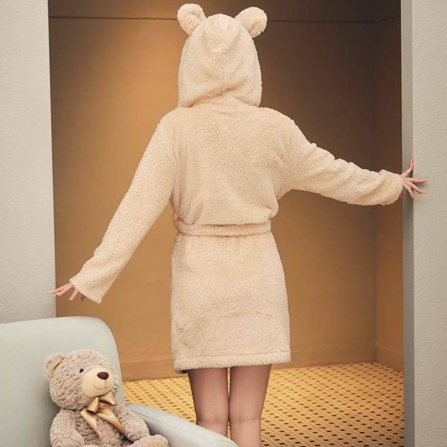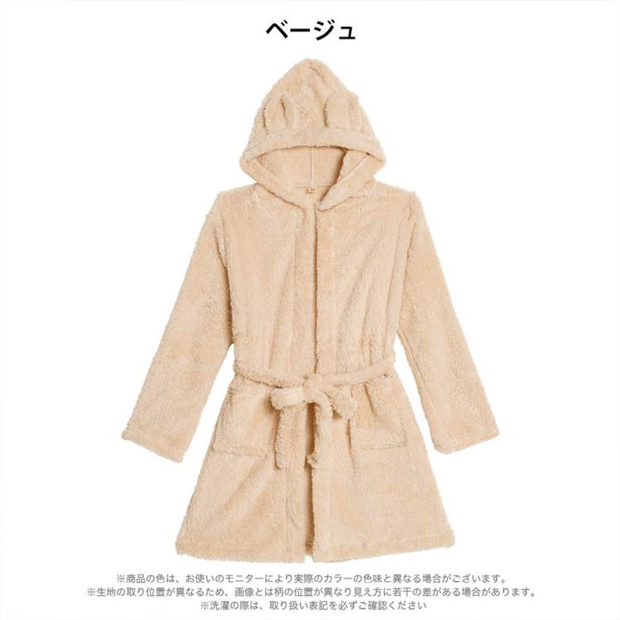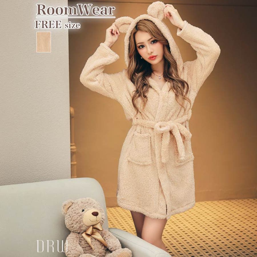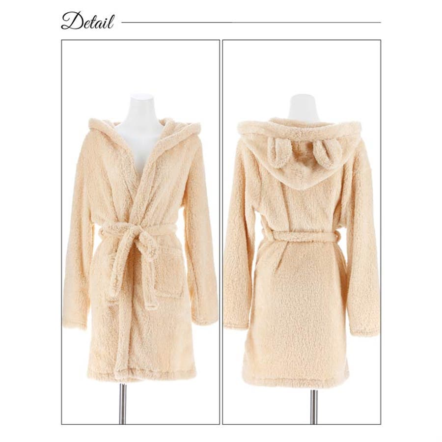 愛らしいくま耳のフードがポイントになった、触り心地の良いモコモコ素材のガウン。
