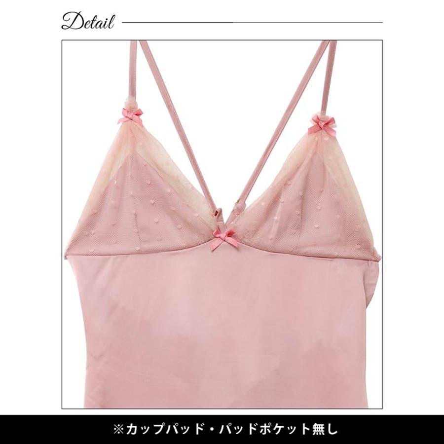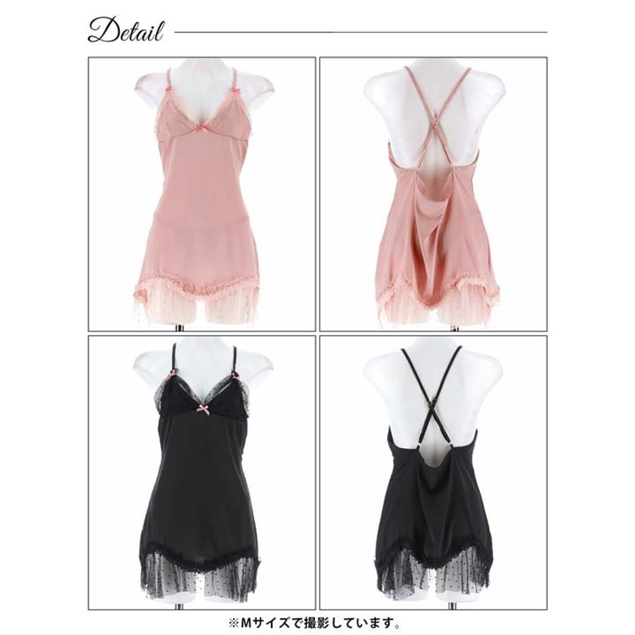 なめらかなサテンにほんのり透けるドット柄チュールを合わせたキュートなベビードール。お花のケミカルレースや小さなリボンをあしらい更に女の子らしさをプラス♪バックはセクシーなクロスデザインで背中を綺麗に見せてくれます◎