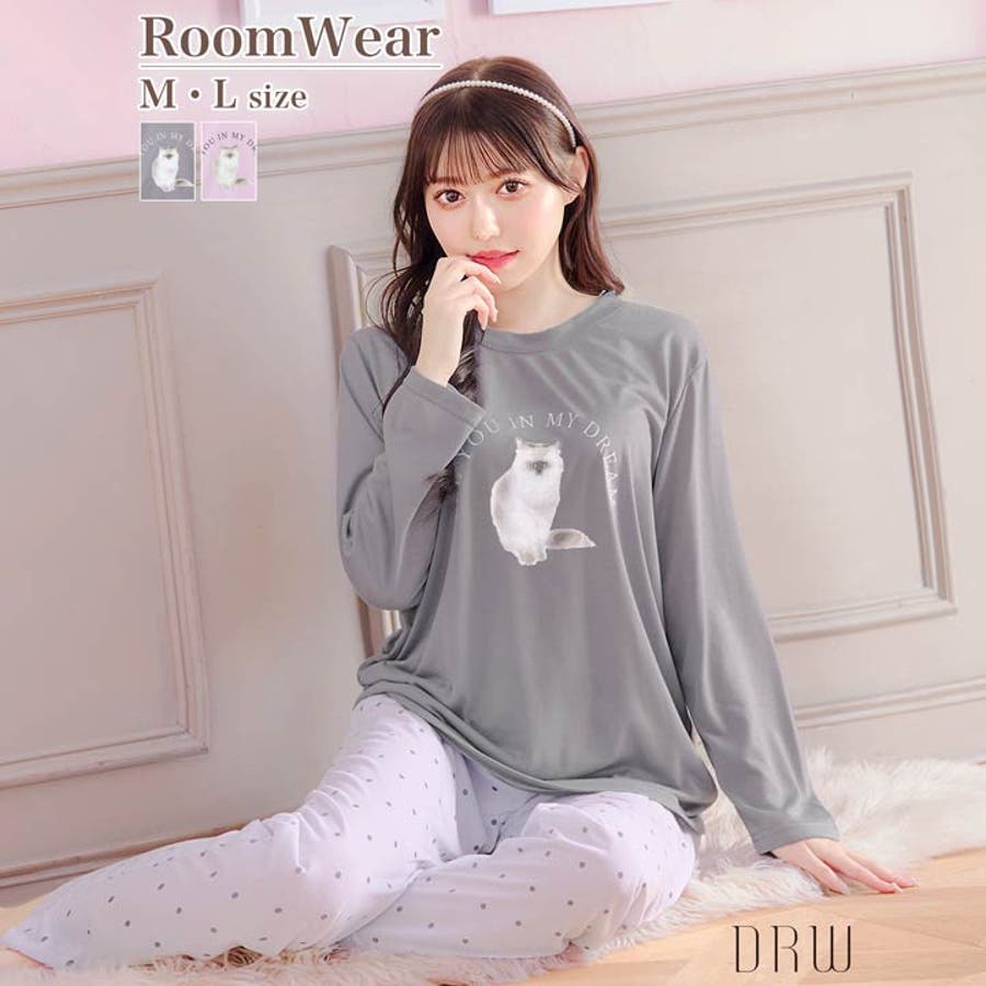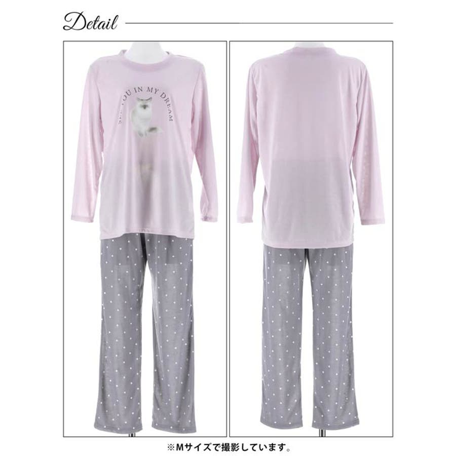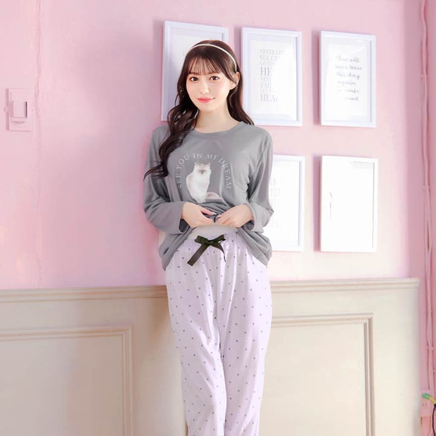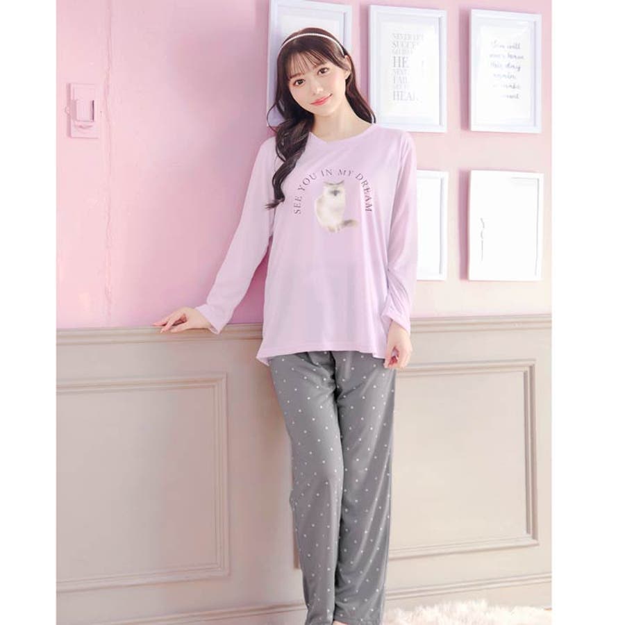キャットモチーフ長袖トップス&ドットロングパンツルームウェア