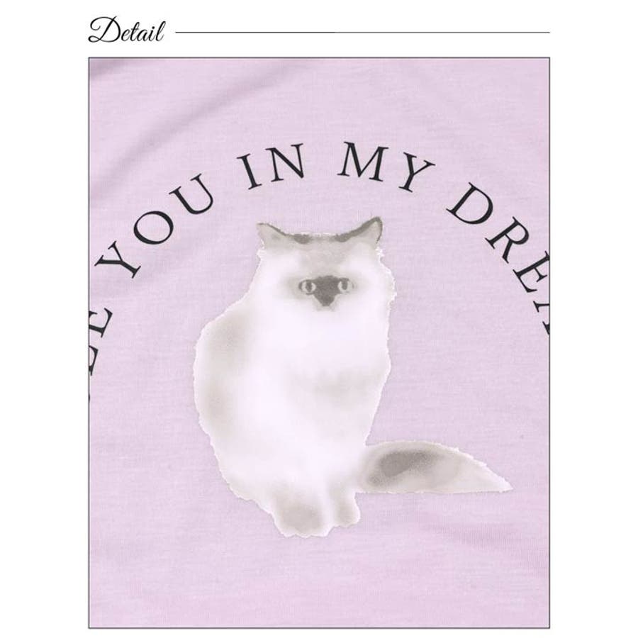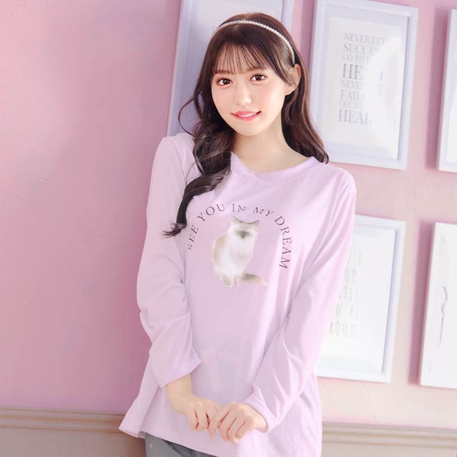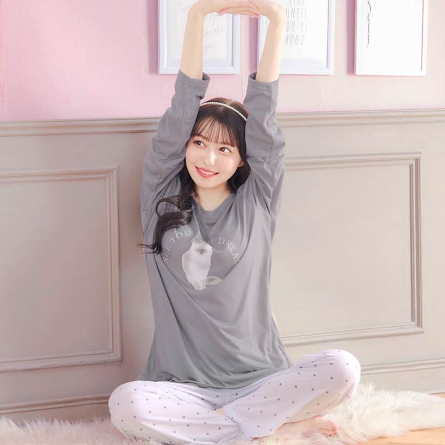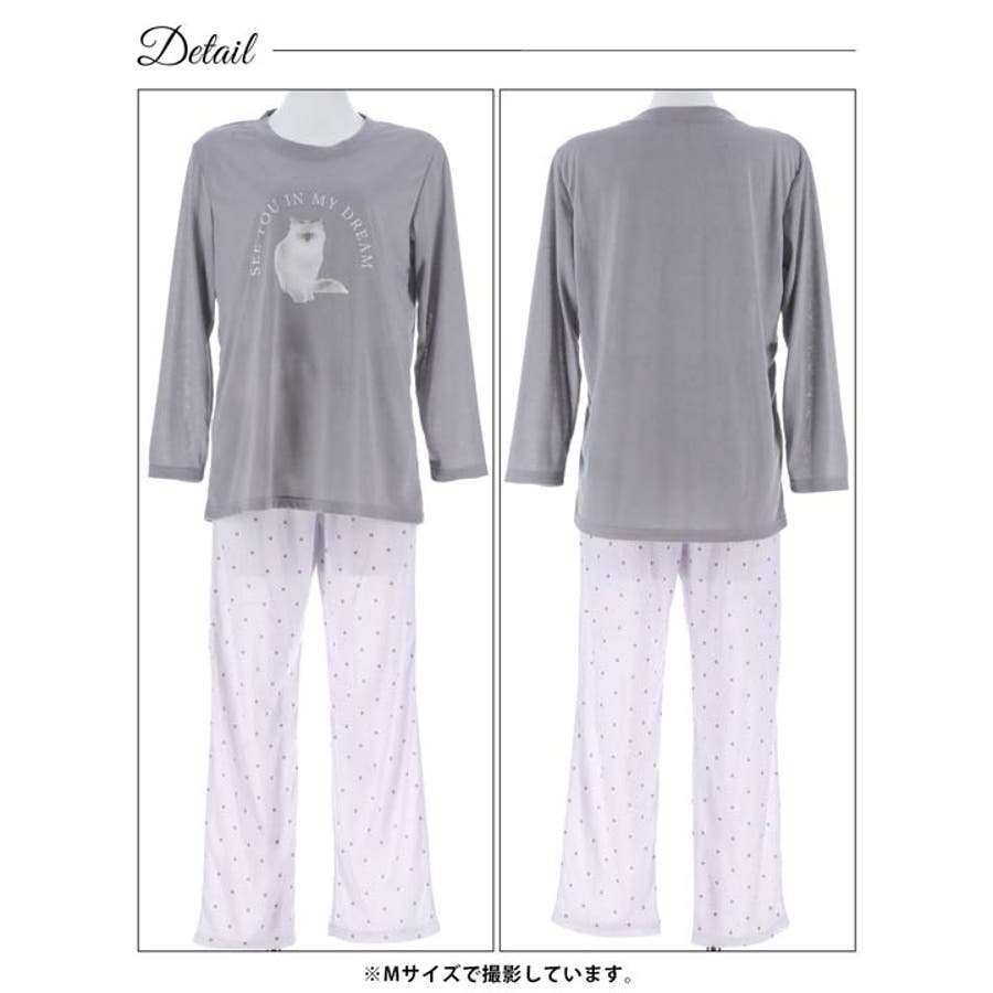 キャットモチーフ長袖トップス&ドットロングパンツルームウェア