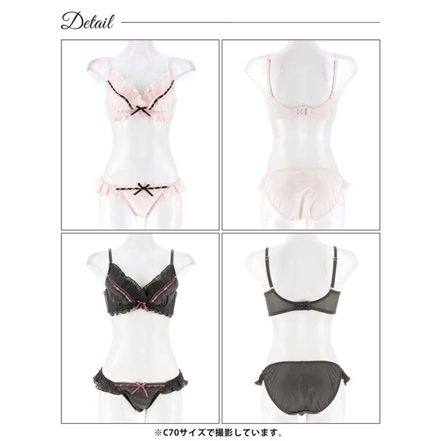 ふんわりとしたプリーツフリルにリボンを通したレースを重ねたフェミニンテイスト満載なランジェリー。