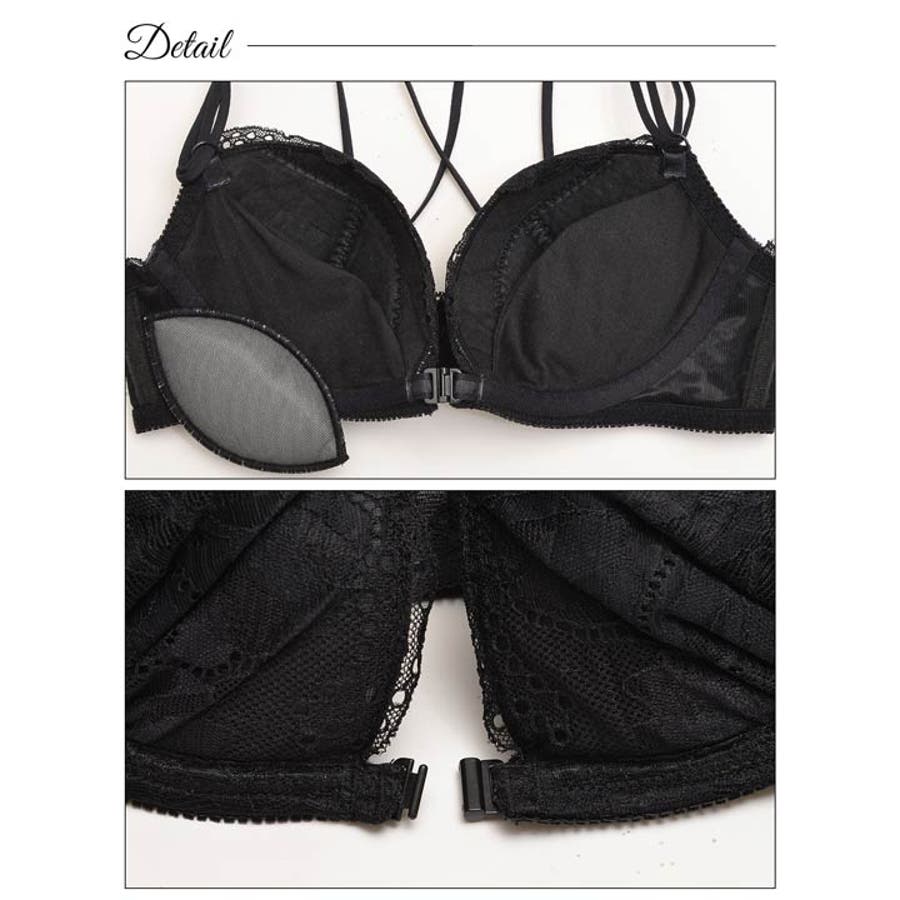シックな色合いのレースが大人な雰囲気漂うフロントホック仕様のランジェリー。バックは交差するマカロニコードデザインで背中見せのお洋服にも最適◎ショーツサイドにもコードを使用し、腰回りを色っぽく演出します。