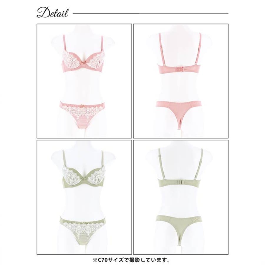 淡いカラーのアーチ柄刺繍レースをあしらったキュートなランジェリー。華奢なリボンとジュエルチャームがさりげないアクセントに♪フルバック・Tバックが両方ついているので気分や場面に応じて使い分けできます◎