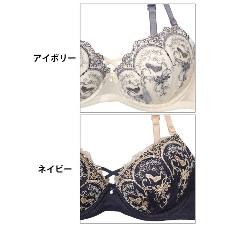 まるで舞踏会へ向かうプリンセスのようなときめきをまとったランジェリー。カップにはハイヒールや草花の刺繍をあしらい、繊細で上品な印象に仕上げました。ほんのりセクシーなクロスコードと輝くシルバーチャームがさりげなく華やかさを添えてくれます◎