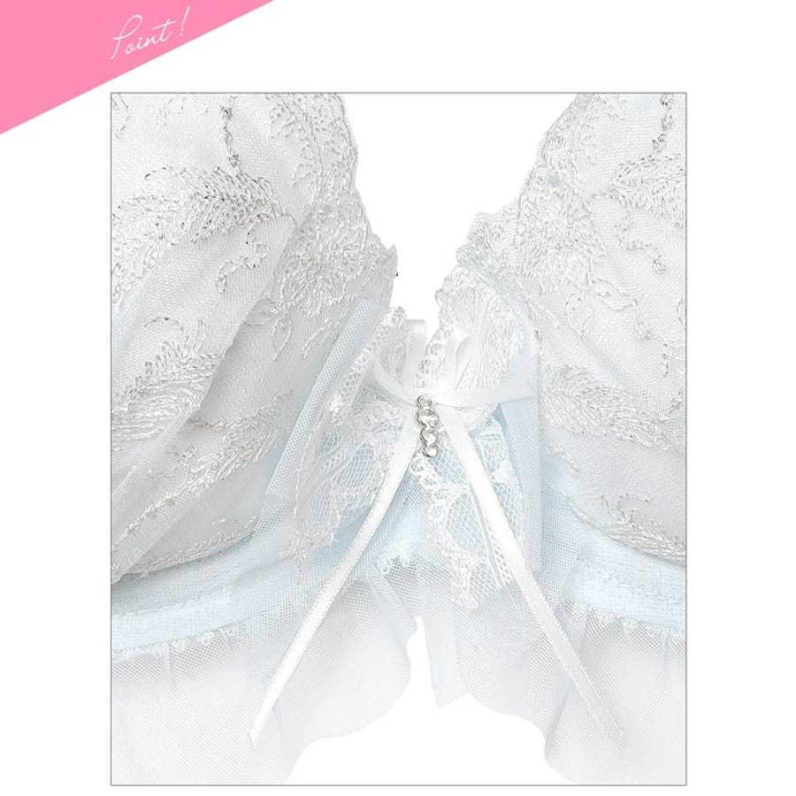 きらめくラメ糸で羽の刺繍を描いた、透明感あふれるロマンティックなランジェリー。アンダーやストラップの軽やかなフリルが華やかさを添えます♪ショーツはサイドにサテンリボンをあしらった紐パン風デザイン!リボンの上にストリングがあるので、ほどけても脱げない安心の仕様です◎