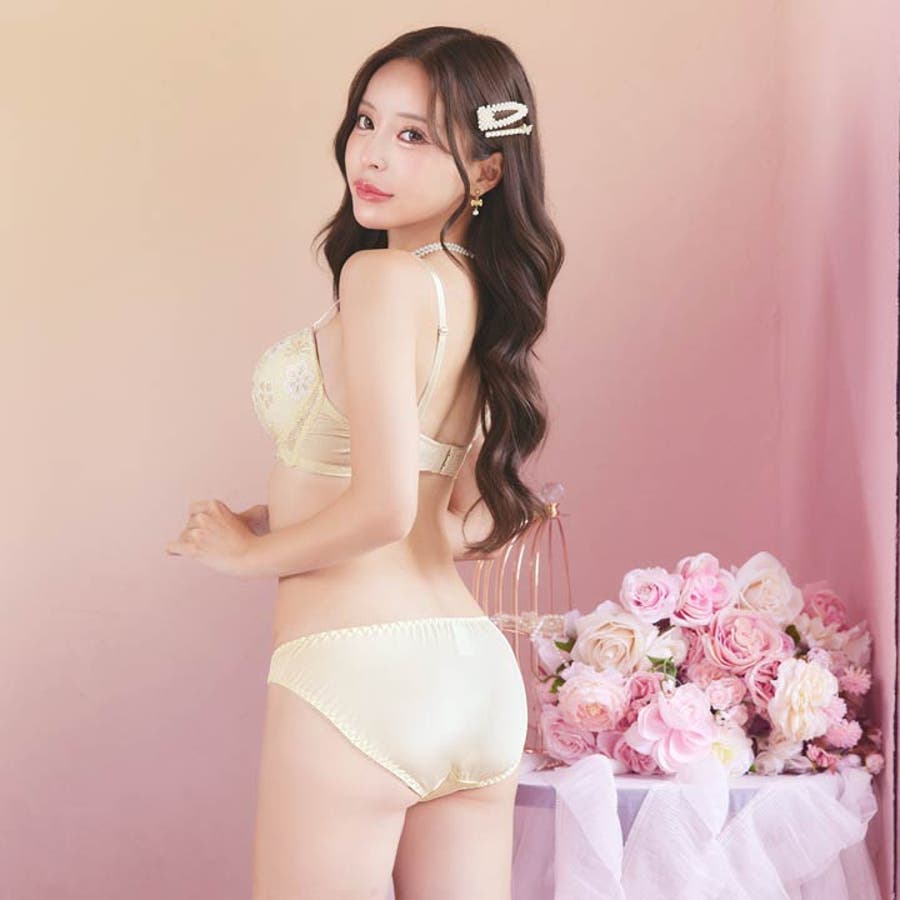 甘いパステルカラーの中に小さな花々の刺繍ゅうが美しいランジェリー。