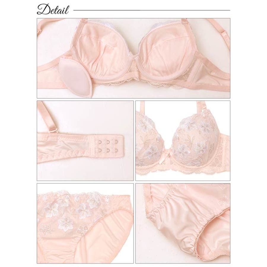 甘いパステルカラーの中に小さな花々の刺繍ゅうが美しいランジェリー。