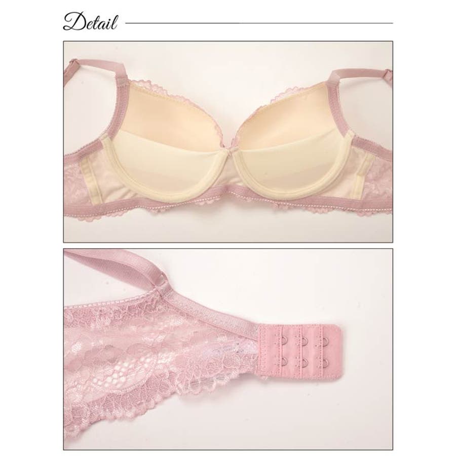 女の子らしいパステル調のレースをふんだんに施したランジェリー。中央部分にはリボン付きで可愛らしい印象に◎ ショーツはバック透けで後ろ姿からも色気漂います。普段もお泊りも使いやすいフルバック仕様です。