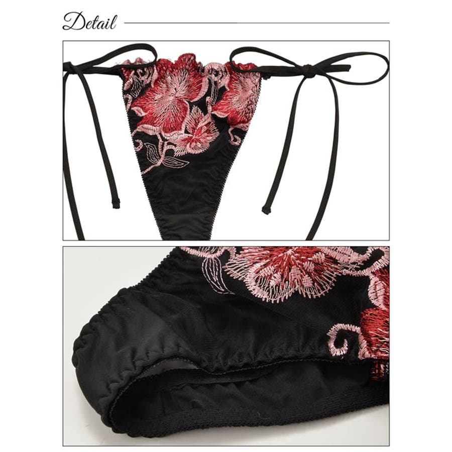ビビッドな色使いの大ぶりのハイビスカス刺繍が目を引くランジェリー。胸元にはラインストーンがキラリと輝きます♪ショーツはリアルにほどける紐パン仕様。特別な日にぴったりです◎