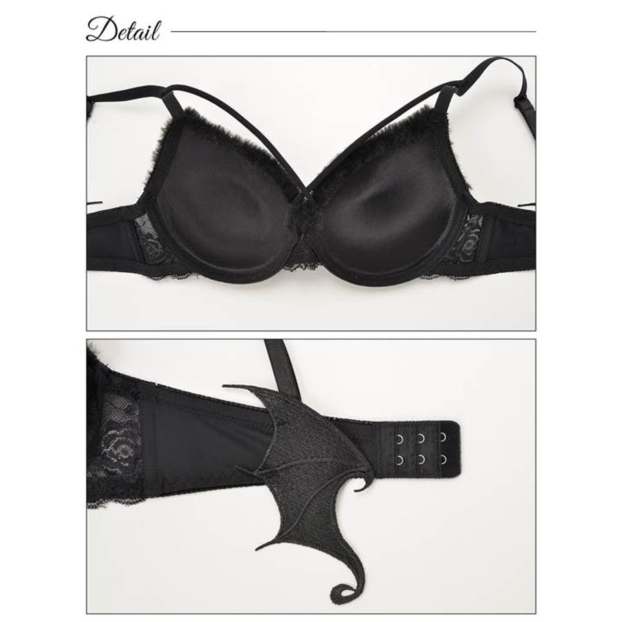 ブラジャーとショーツに小悪魔な羽と尻尾を施したランジェリー。もこもこ素材とレース仕様がラブリーな印象に◎ コスプレやハロウィンシーズンにも大活躍な1着です♪