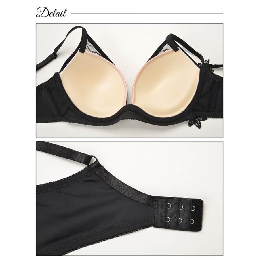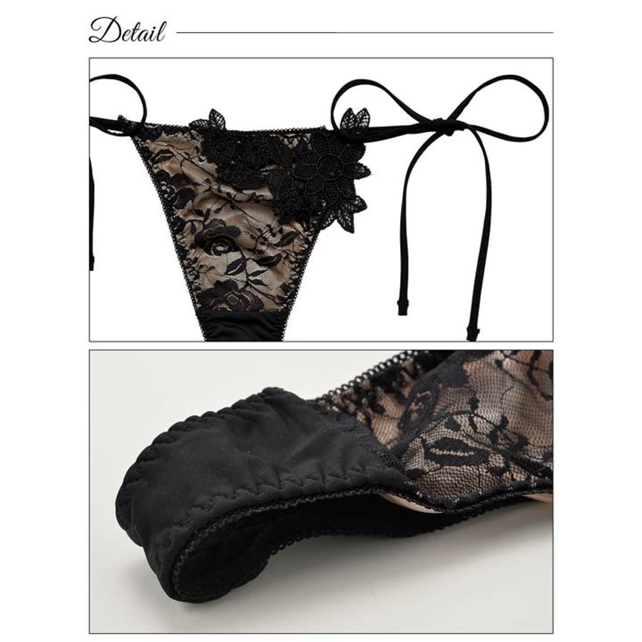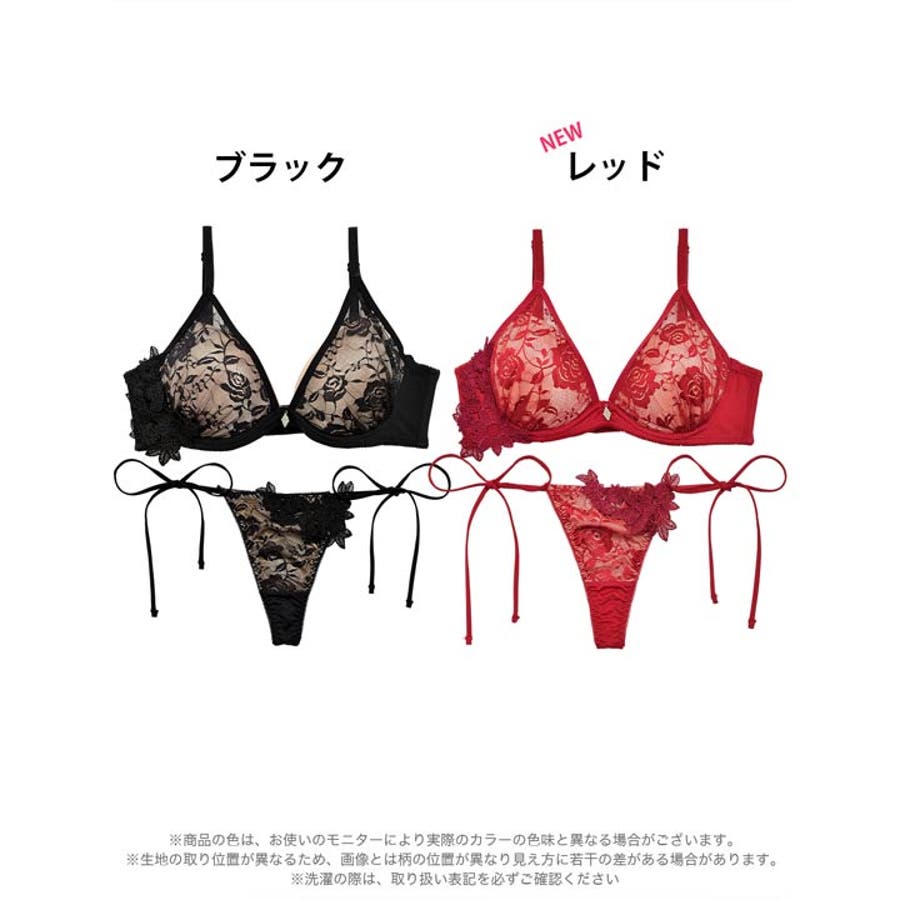 ローズ刺繍のレースがセクシーなランジェリー。カップのサイドにはお花のワッペンも付いて胸元を華やかに魅せてくれます◎セットのショーツは紐パン仕様♪