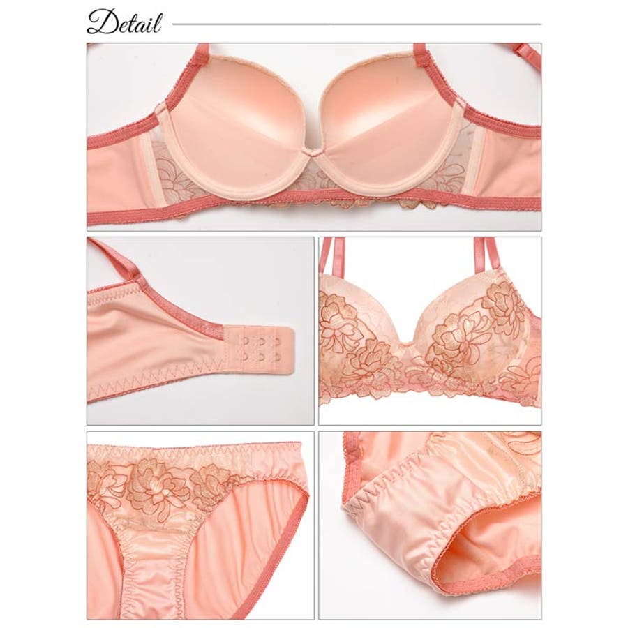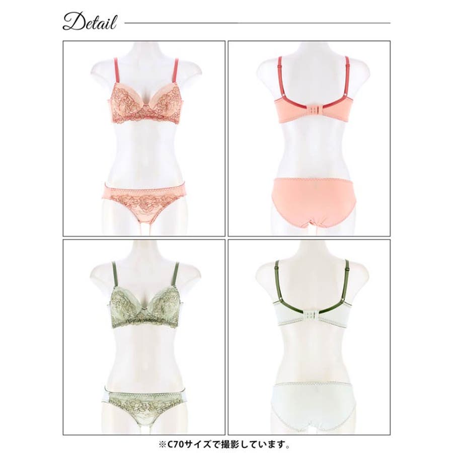繊細なレースのカップに満開のフラワー刺繍を重ねた上品な印象のランジェリー。ノンワイヤー仕様なので締め付け感が軽減されストレスフリーな着け心地♪ショーツはノーマルタイプのフルバックで普段使いにも最適です!