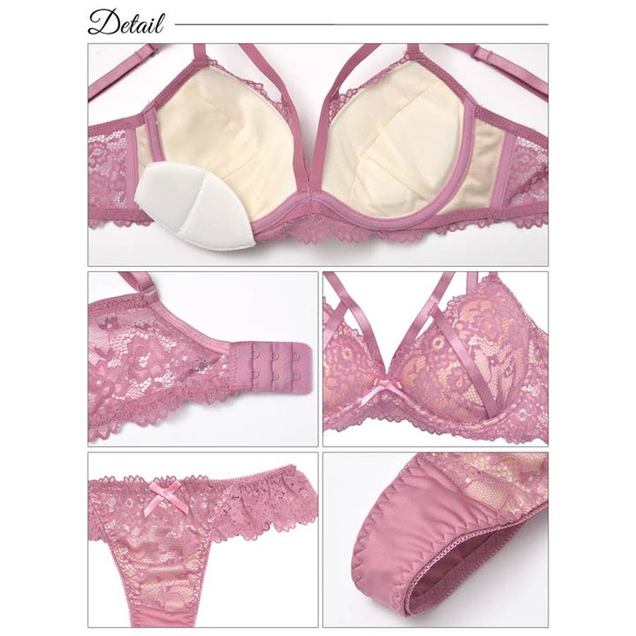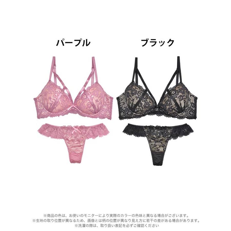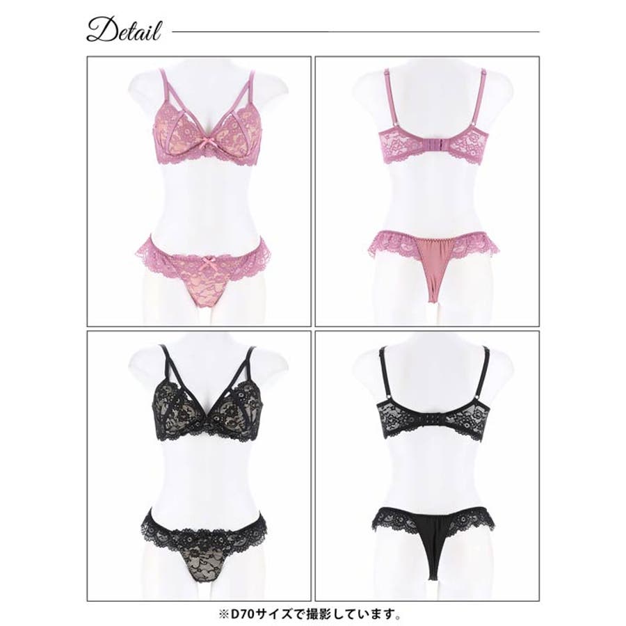 全面フラワーレース仕様と引き寄せられるような同系色のコードを重ねた色気漂うランジェリー。コードから覗く大胆な肌魅せと、リボン装飾のワンポイントが女性らしさたっぷりな1着です◎