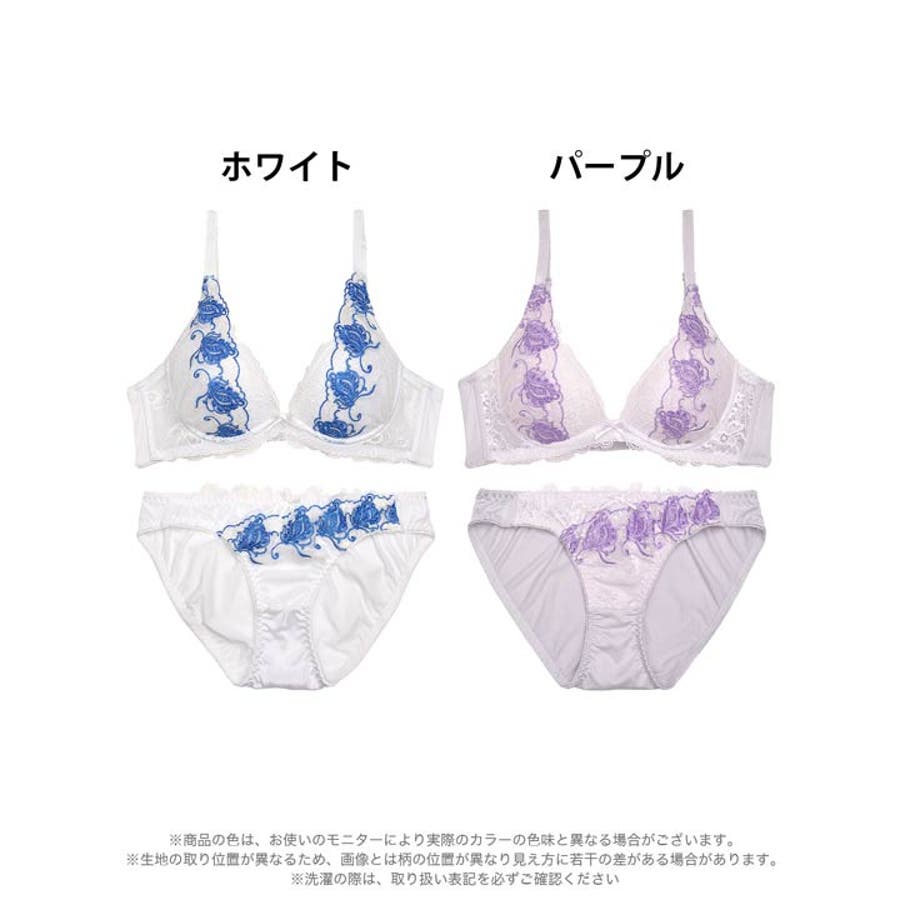 清潔感漂うホワイトのレースに、ダマスク調の刺繍レースを重ねた上品なランジェリー。中心にあしらわれた華奢なリボンがさりげなくキュートなポイント♪ショーツはノーマルタイプのフルバックで普段使いもしやすい一着です。