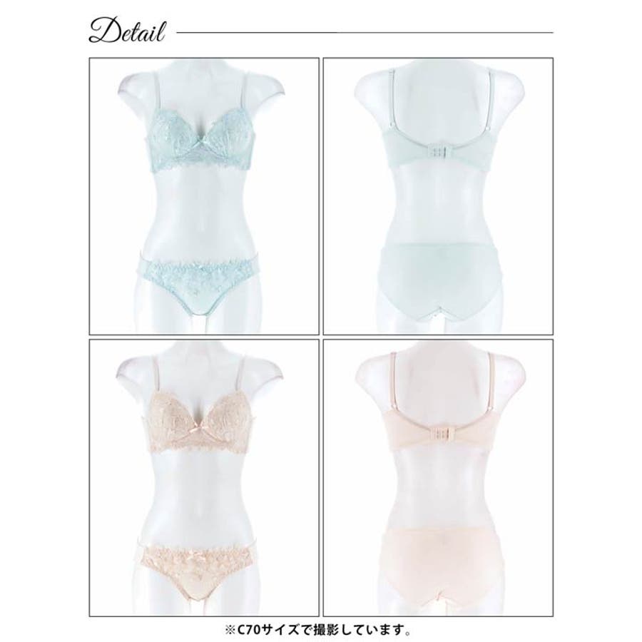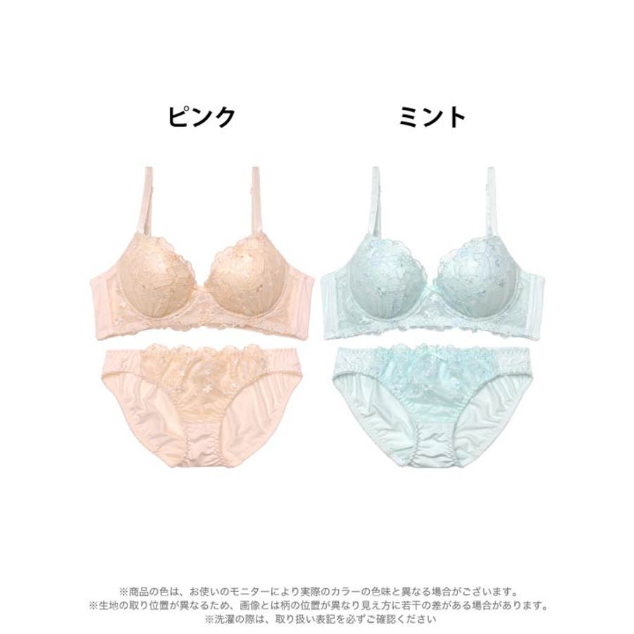 かわいらしいリボンと小花柄の刺繍をたっぷりと施したスイート&ガーリーなランジェリー。バストの横流れを防ぎキレイな谷間をキープしてくれる脇高設計◎さらにノンワイヤータイプなので締め付け感もなくストレスフリーな着け心地です!