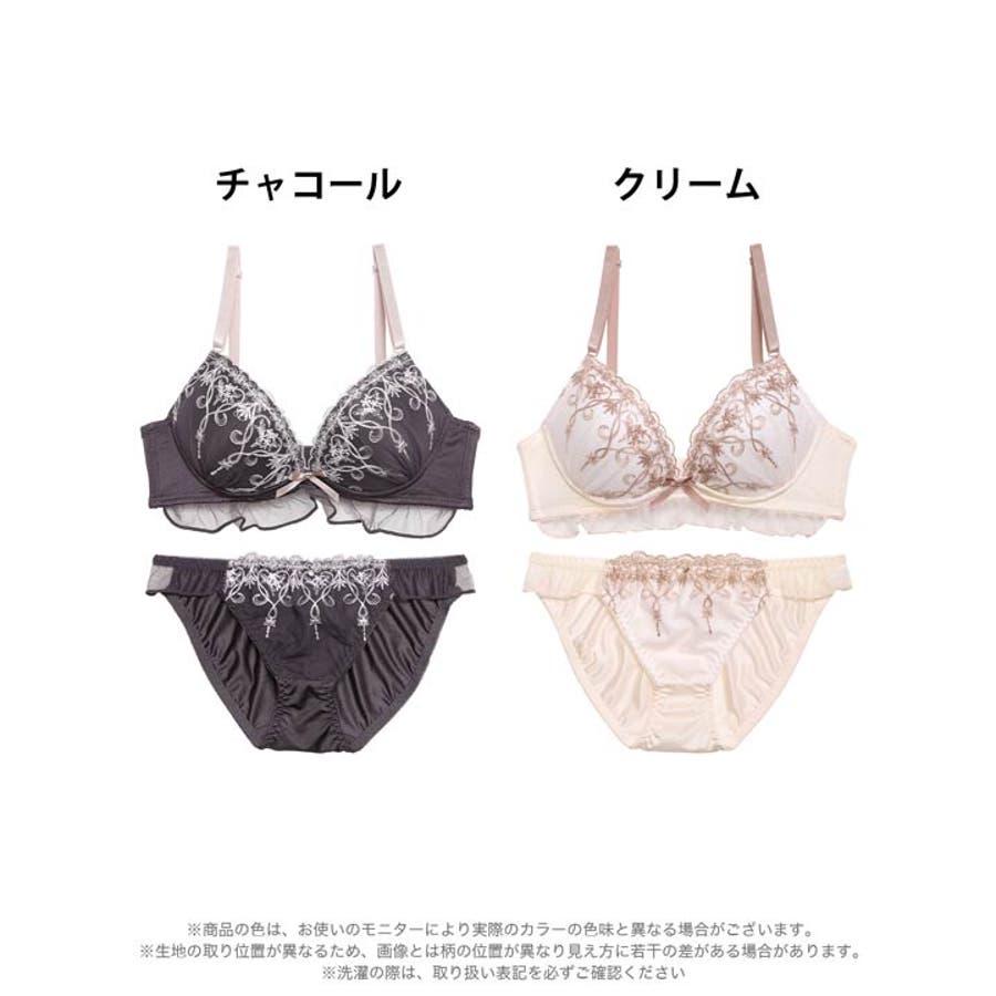 ダマスクモチーフのハート柄刺繍が上品なランジェリー。アンダー部分にふんわりとした透け感のあるフリルをあしらいガーリーな印象に◎ ショーツサイドのチュールラインの肌透けで色気も欠かさない1着です♪