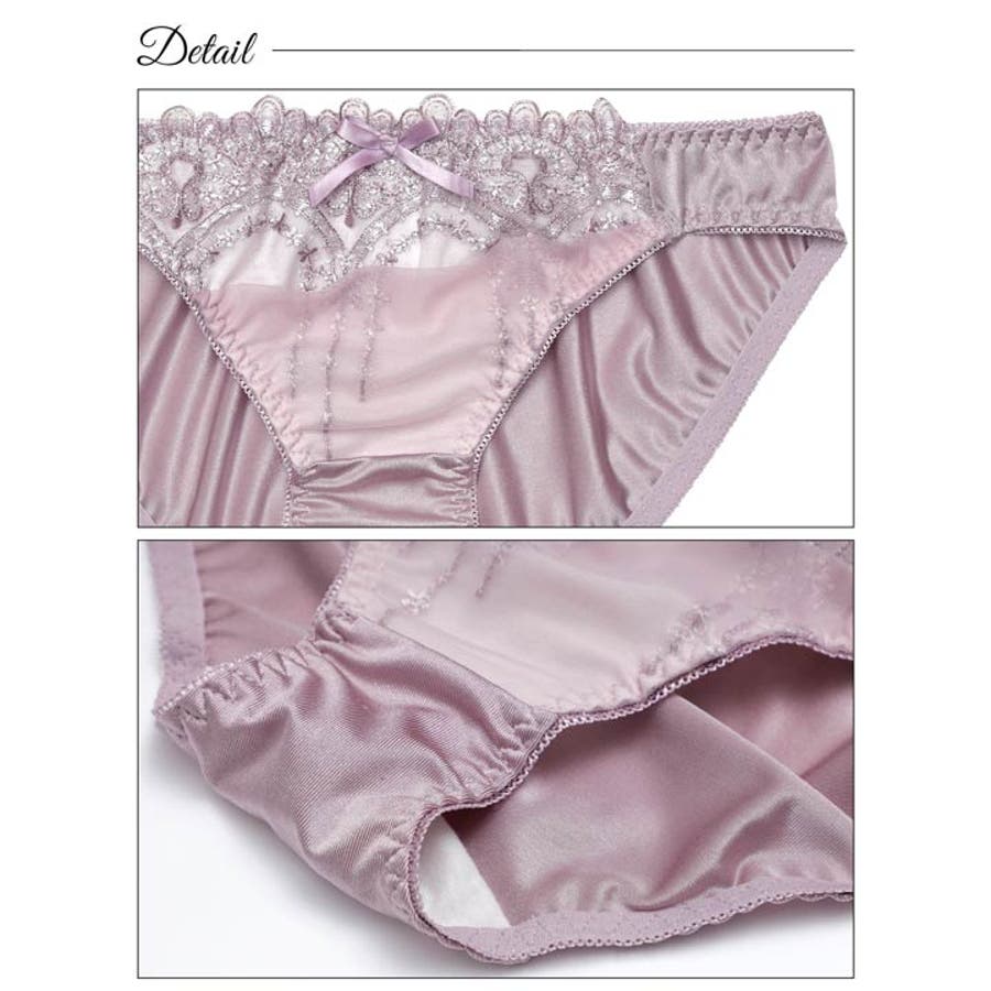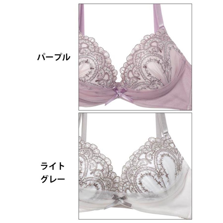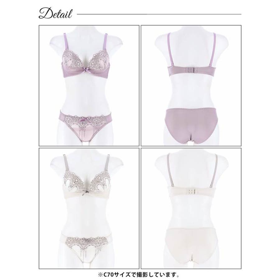 くすみカラーのアーチ刺繍をふんだんに施したキュートなデザインのランジェリー。ふんわりと重ねたドレープチュールやサテンリボンの装飾が華やかさをアップさせます♪ショーツはノーマルタイプのフルバック仕様でデイリー使いにもぴったりです!