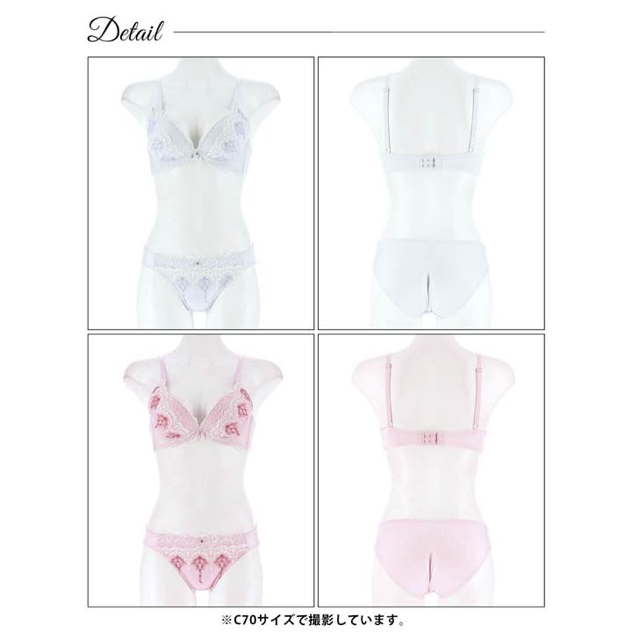 女の子らしい柔らかいパステルカラーに繊細なレース生地を重ねたランジェリー。全面にあしらわれたダマスクモチーフのフラワー刺繍が上品さをプラスします◎ ショーツは場面を問わず使いやすいフルバック仕様です。