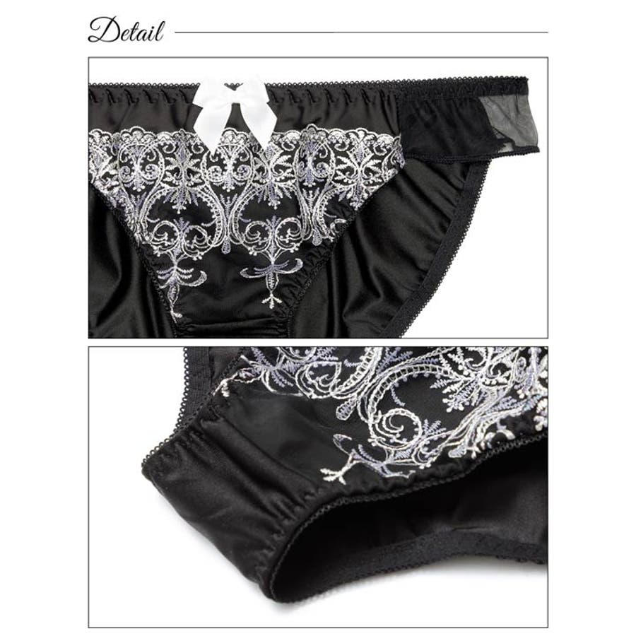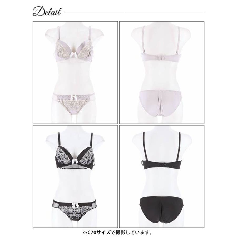 艶のあるサテンに、豪華なボタニカル刺繍入りのチュールレースを重ねた上品なデザインのランジェリー。ふんわりしたシアーフリルや大きなリボンをあしらいほどよく甘さもプラス◎ショーツは伸びの良いフルバック仕様でデイリー使いもしやすい一着です♪