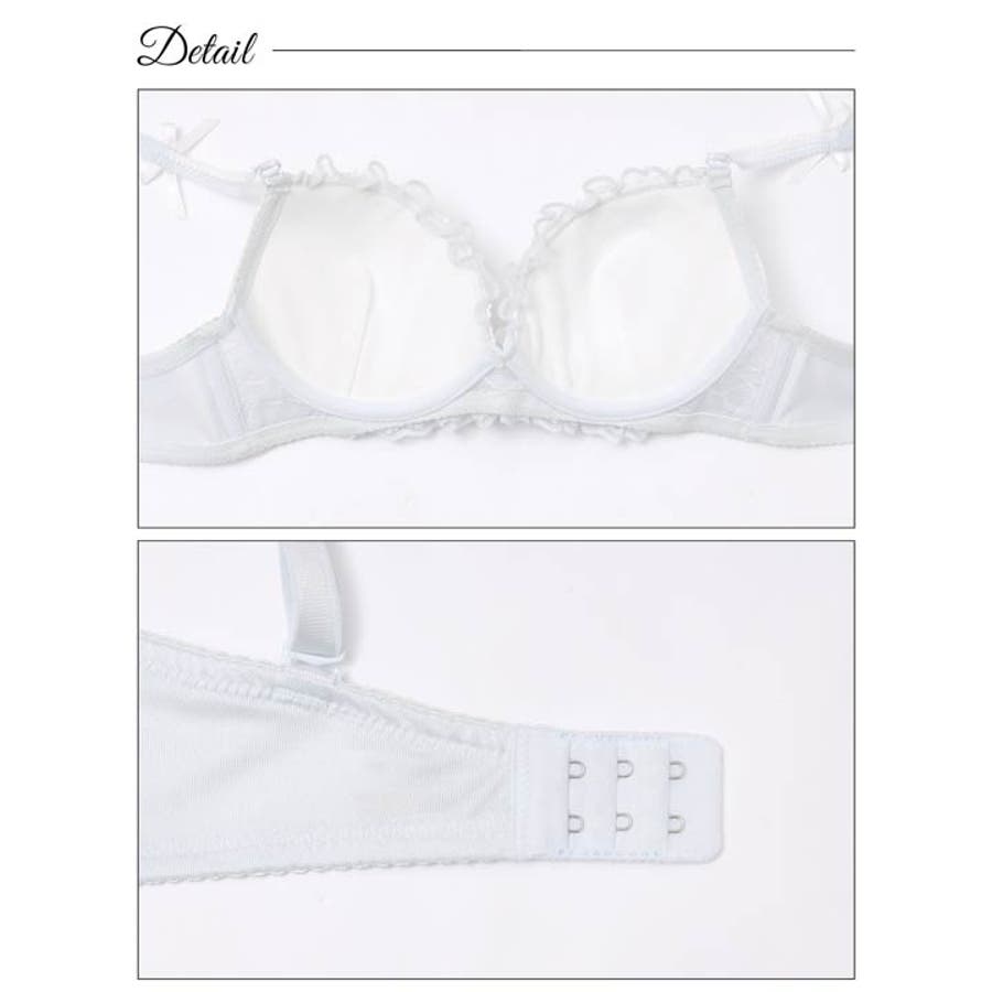 蝶モチーフのケミカルレースが上品&キュートな淡いカラーリングのランジェリー。ストラップやフロントにあしらったサテンリボンが女の子らしさをアップさせます◎ショーツはほどよく透けるサイドフリルがポイントになったフルバック仕様です!