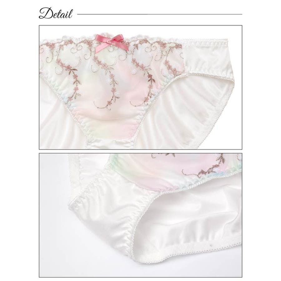 美しいグラデーションのカップにきらりと輝くラメ入りの小花&ツタ柄刺繍を重ねたランジェリー。中央にはストラップと同色のリボンをあしらい女の子らしい雰囲気に♪ショーツはほどよいフィット感のフルバック仕様で履き心地も快適です◎