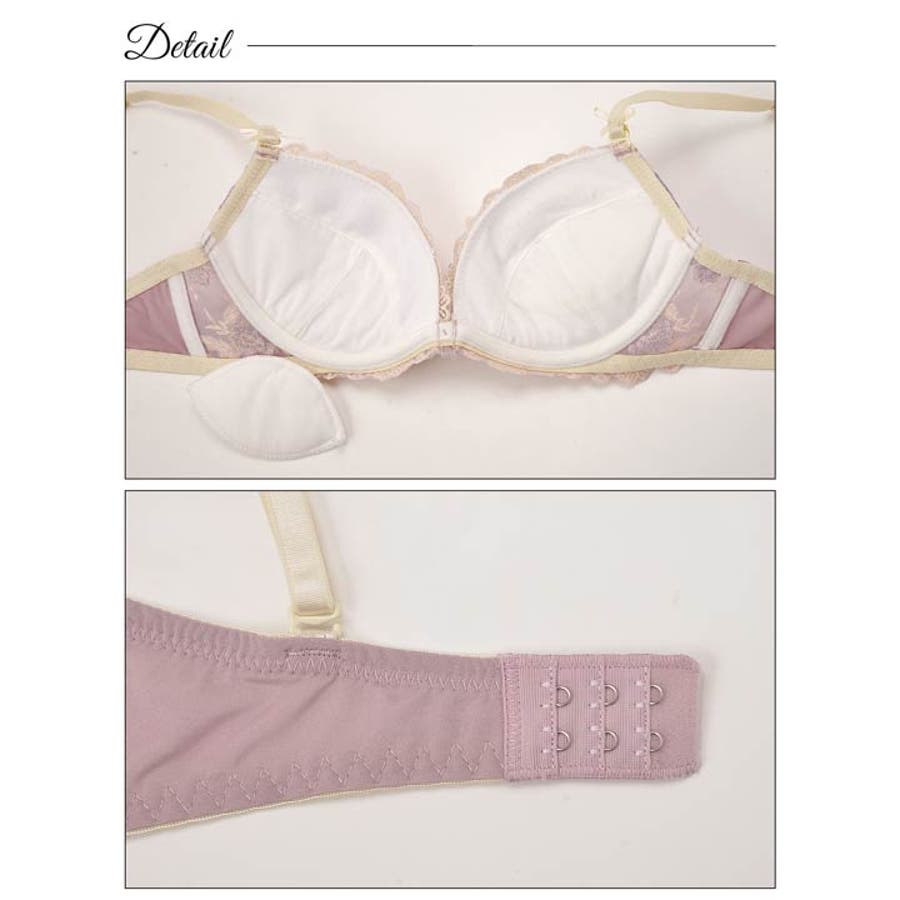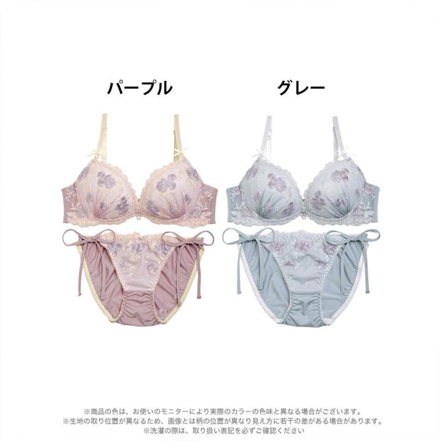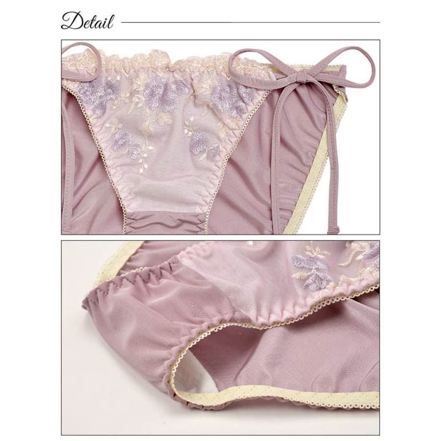 カップとショーツフロントにフラワー刺繍を施したランジェリー。ダスティカラーで甘くなりすぎず上品さも兼ね備えたデザイン!ショーツはDRWオリジナルのリアルに解ける紐パン♪特別な夜にもおすすめの一着です。