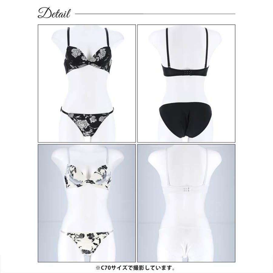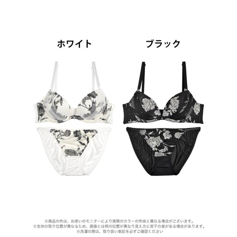 クール&ビューティーな雰囲気漂うモノトーンカラーのフラワーモチーフがお洒落なランジェリー。さり気ないチュール重ねと、キラリと輝くチャームがアクセントに◎ サイドのストリングデザインが色っぽい1着です♪