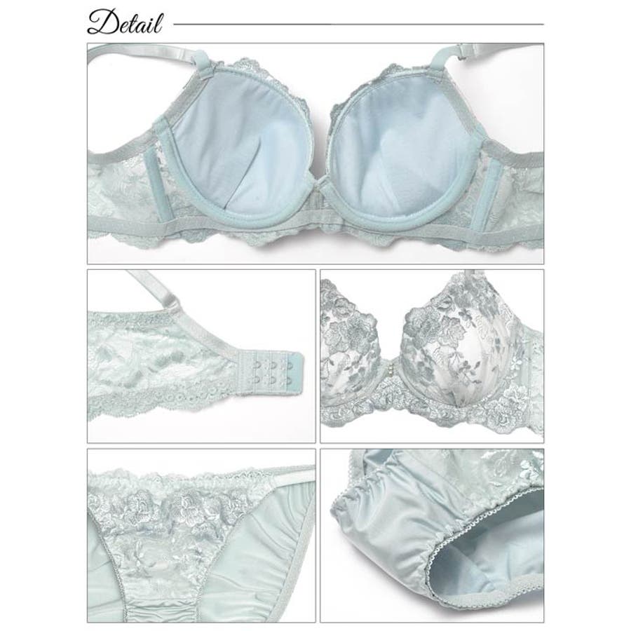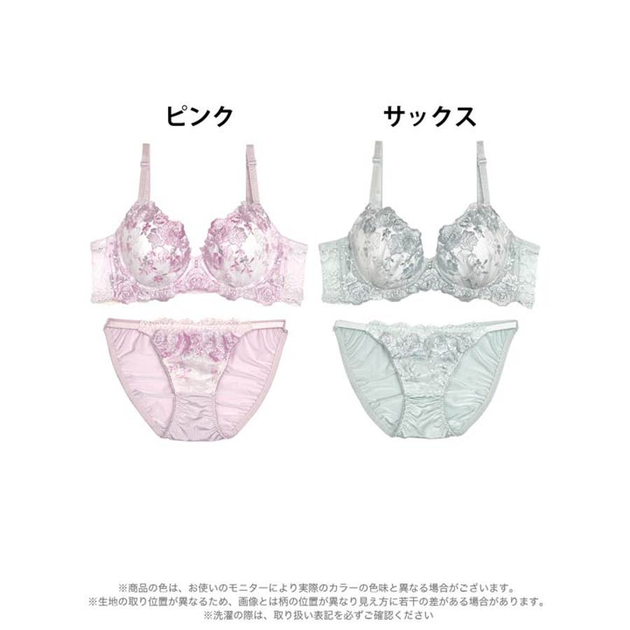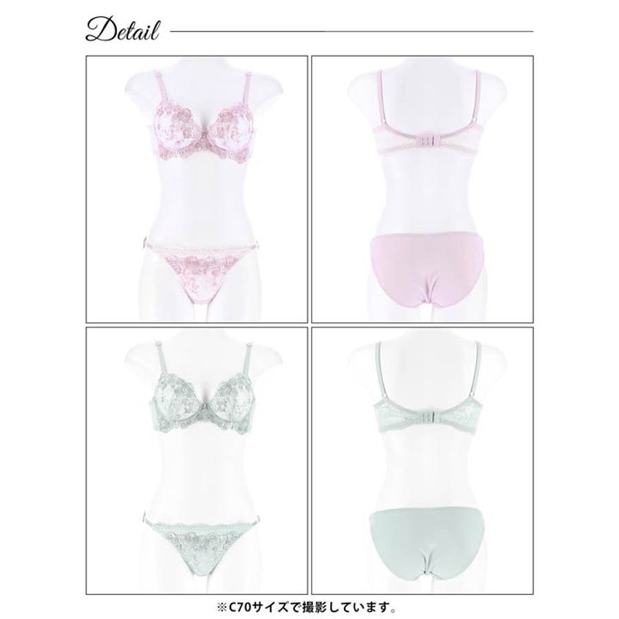 くすみカラーのローズ刺繍をあしらった上品で女性らしい印象のランジェリー。ブラのアンダーベルトは素肌がほんのり透けるシアーレース仕様♪ショーツサイドはストリングデザインで腰元を華奢見せしてくれます◎