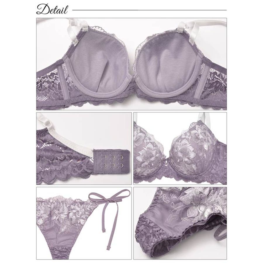 ダスティカラーのレースに、ホワイトの刺繍糸でローズ刺繍を施したエレガントなランジェリー。中央にはシルバーのチャームをあしらい華やかさをプラス。ショーツはほんのりセクシーなほどけるサイド紐仕様です♪